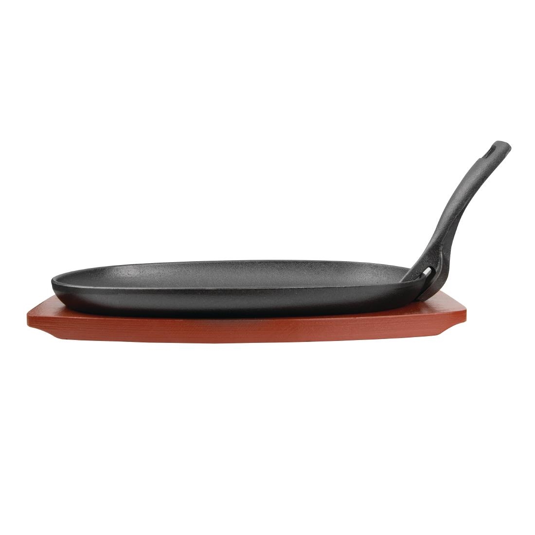 Heavy-duty cast iron pans are perfect for serving sizzling dishes directly to the table. These pans are supplied with wooden stands, ensuring both functionality and style in your dining presentation.