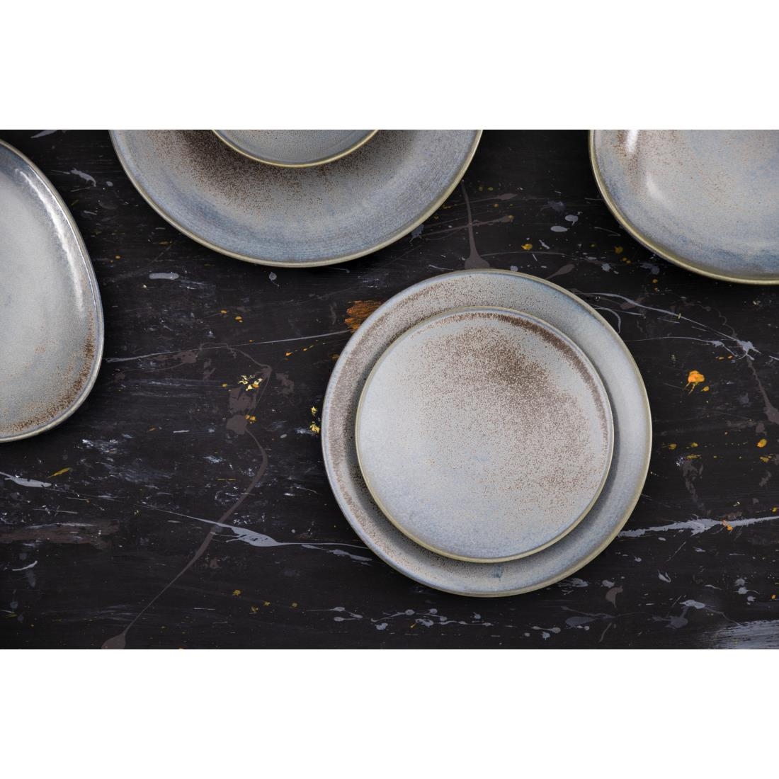Experience the rustic charm and practical elegance of Olympia's Ember Blue dinnerware collection. These Ember Blue 180mm coupe plates boast a distinctive blue and brown reactive glaze, which gives the effect of ash, hot charcoal, and oxidized metal. The plates are well-suited for rustic or industrial settings and are perfect for all-day dining, dinner service, and gastropubs alike.
