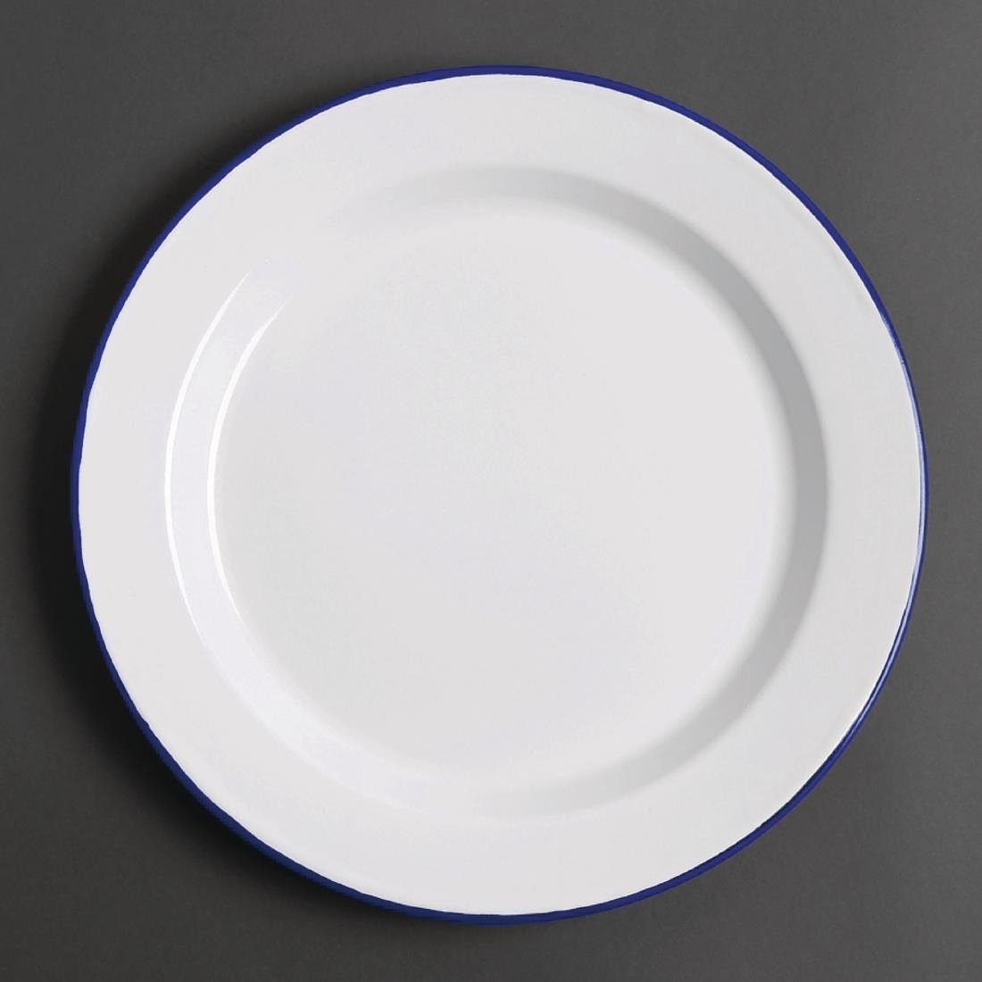 Creating a table setting with charm is easy with this range of blue and white enamel tableware. This dinner plate from Olympia is crafted from heavy-duty stainless steel and is covered with an ultra-durable, fused-glass coating, leaving a finish that is smooth to the touch. The more you use and cook with these plates, the more character they will take on. The enamel coating provides the plates with heat and chemical resistance, meaning they are safe to use in the oven and can be washed in the dishwasher.