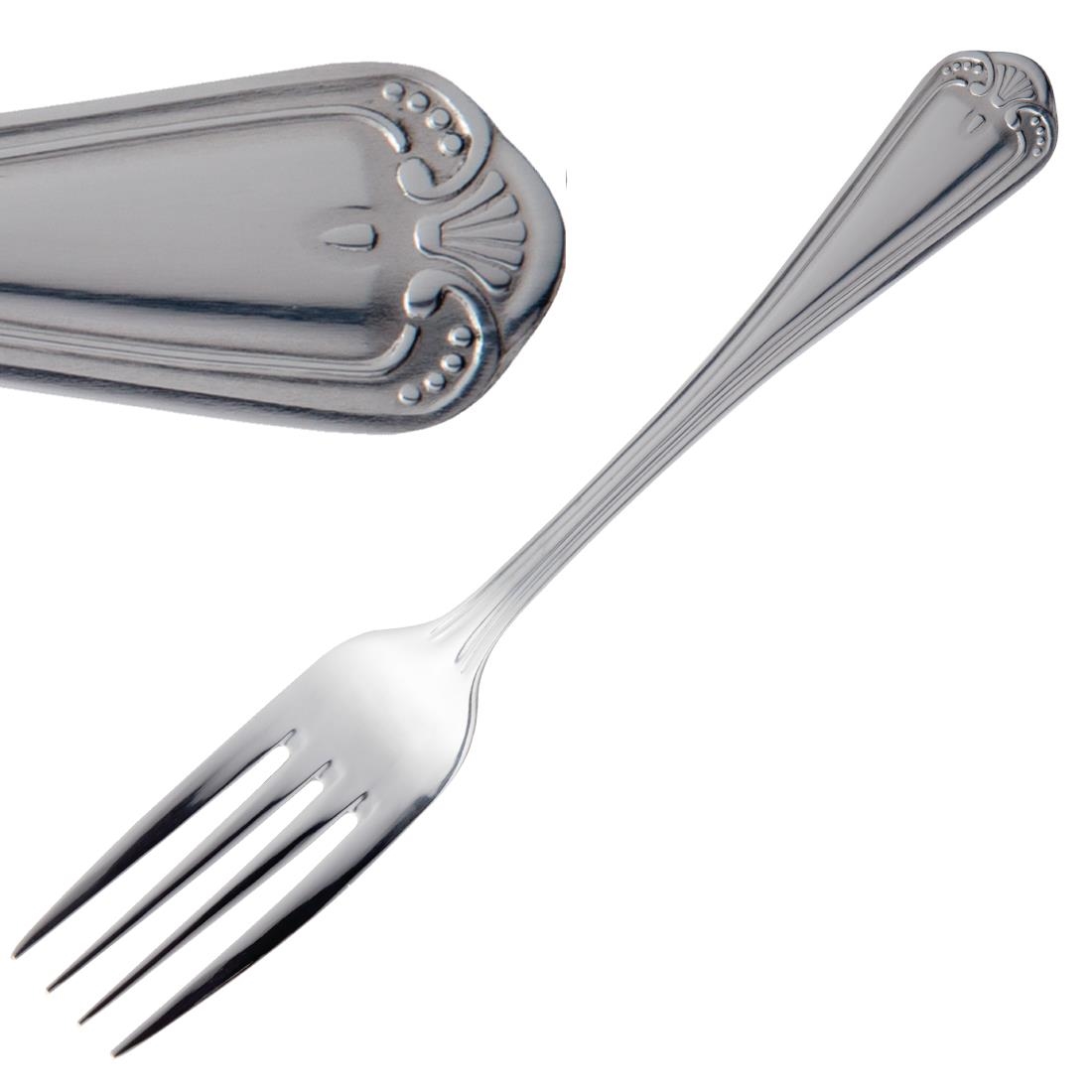 The product is crafted from polished 18/0 stainless steel and features a shell motif detailed on the handle. It is sold in dozens.
