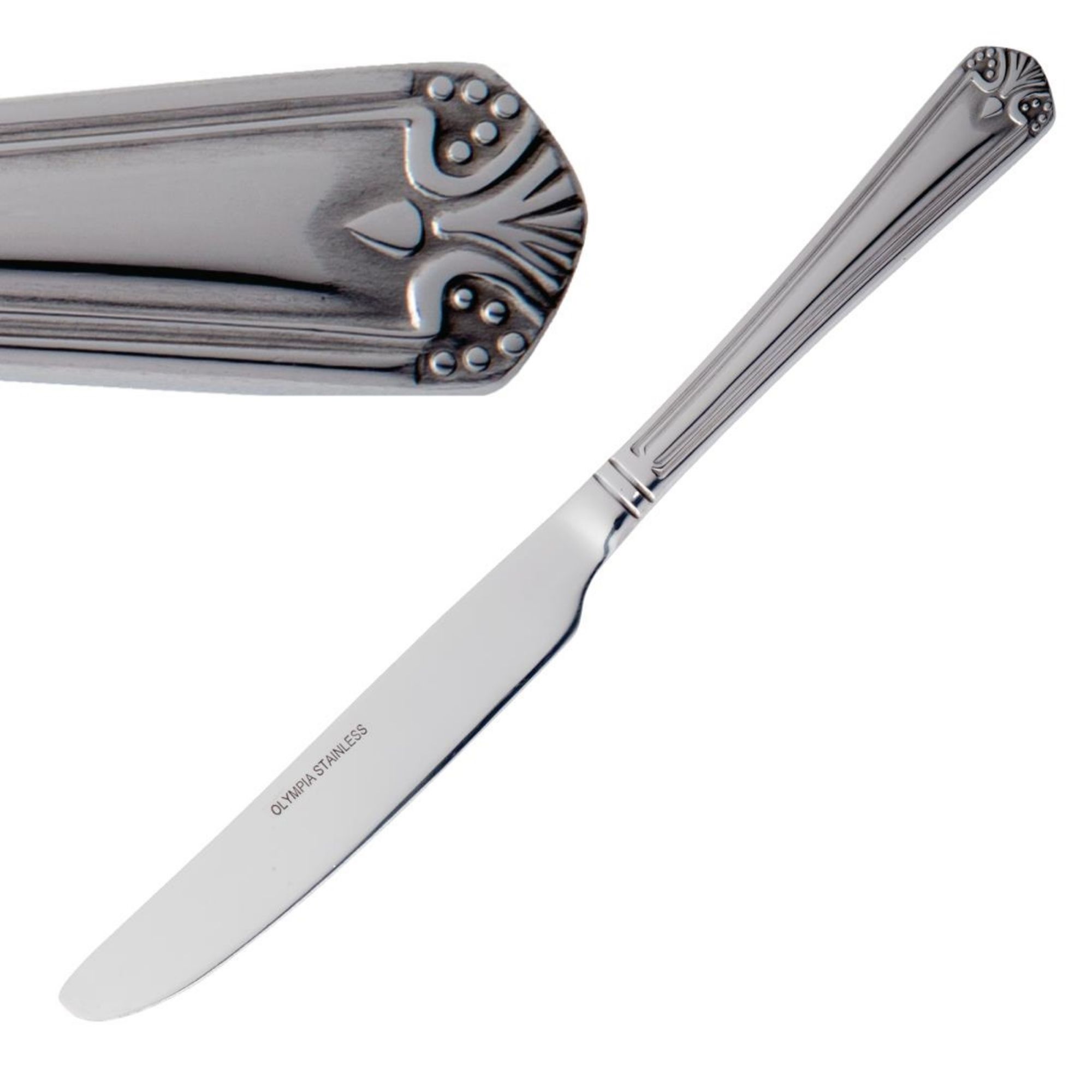 The product is crafted from polished 18/0 stainless steel and features a detailed shell motif on the handle. It is sold in dozens.