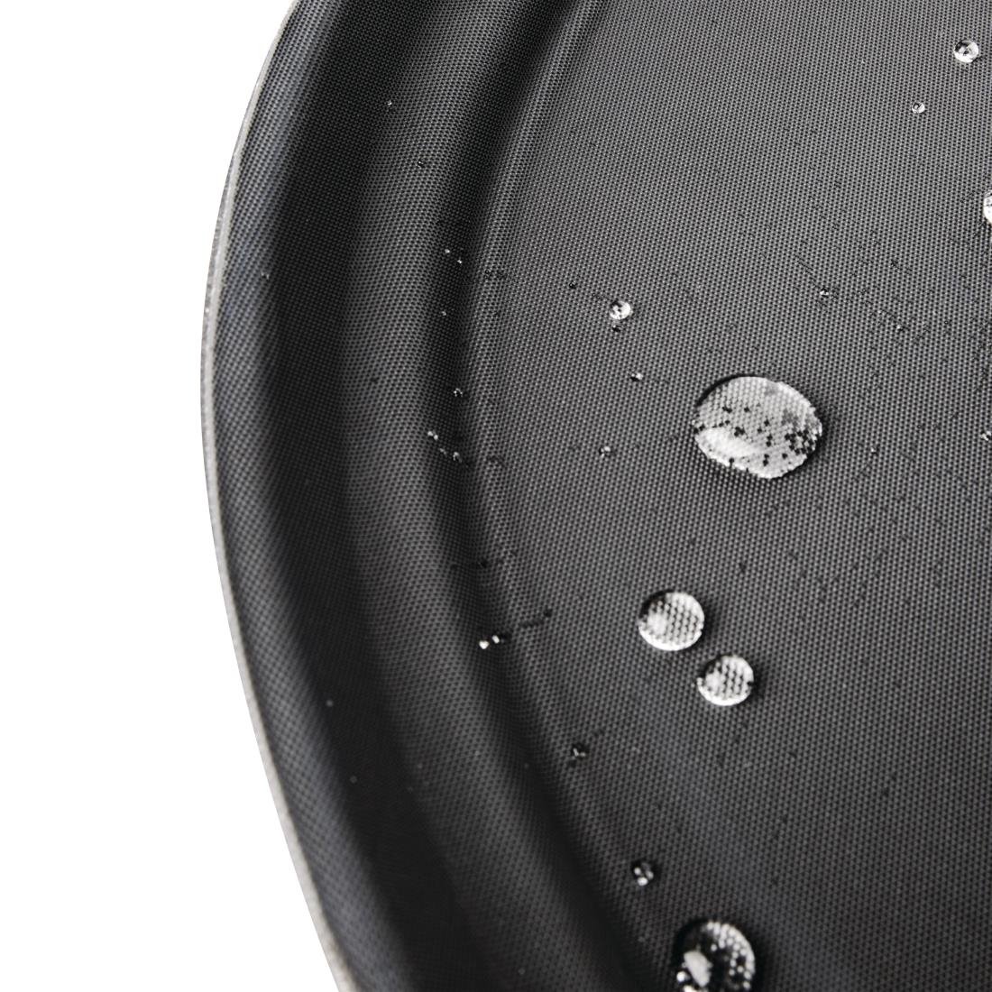 The black anti-slip oval tray is designed to provide a secure and stable surface for carrying items. Its anti-slip feature ensures that items remain in place, reducing the risk of spills or accidents. The oval shape offers a stylish and modern look, making it suitable for both professional and home settings. This tray is ideal for serving drinks, food, or any other items that require a steady hand. Its durable construction ensures long-lasting use, while the sleek black finish adds a touch of elegance to any occasion.