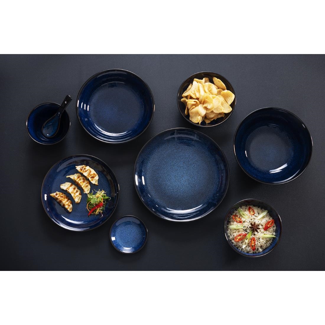 Olympia's Luna range features a midnight blue reactive glaze on the face of the plate or bowl, complemented by a black outer rim and edge. This deep color glaze serves as the perfect backdrop to make fresh and bright ingredients pop. Predominantly consisting of bowls, Luna is tailor-made for noodle, rice, and broth-based dishes.