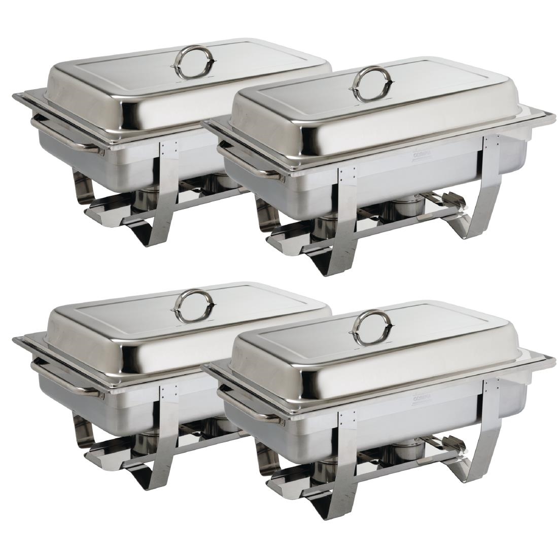 Boost your food warming capacity and save money with this exceptional chafing offer. The set includes mirror-polished 18/0 stainless steel 1/1 gastronorm-sized chafers, complete with a water pan, a 9-litre food pan, a cover, and two fuel holders. Additionally, a lid support is available, which positions between the frame and water pan, allowing the lid to rest behind the long side (CB722). The Bain Marie set (CB723) features two 4-litre stainless steel pots with handles and notched lids, designed to sit on top of the water pan.