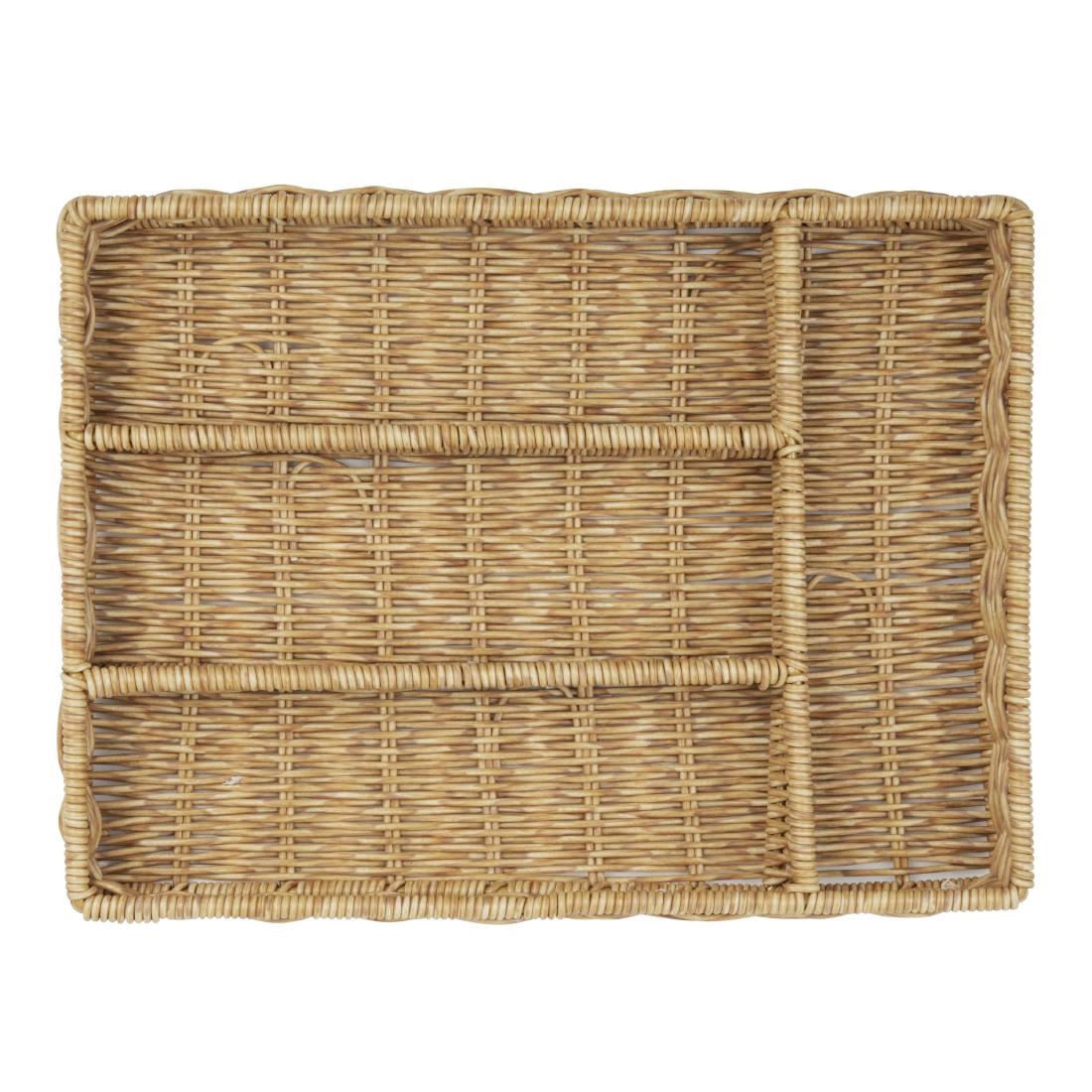 Introducing our Olympia cutlery organiser, crafted from durable polywicker in a light brown finish. Designed for efficient table service during lunch and dinner, this tray features four spacious compartments, making it easy to store and access cutlery and smaller utensils. It helps keep service areas neat, tidy, and well organised throughout busy shifts. The rustic, farmhouse-style design adds a warm, natural touch to any dining setup. Once service is over, simply place the tray in the dishwasher for quick and cleaning.