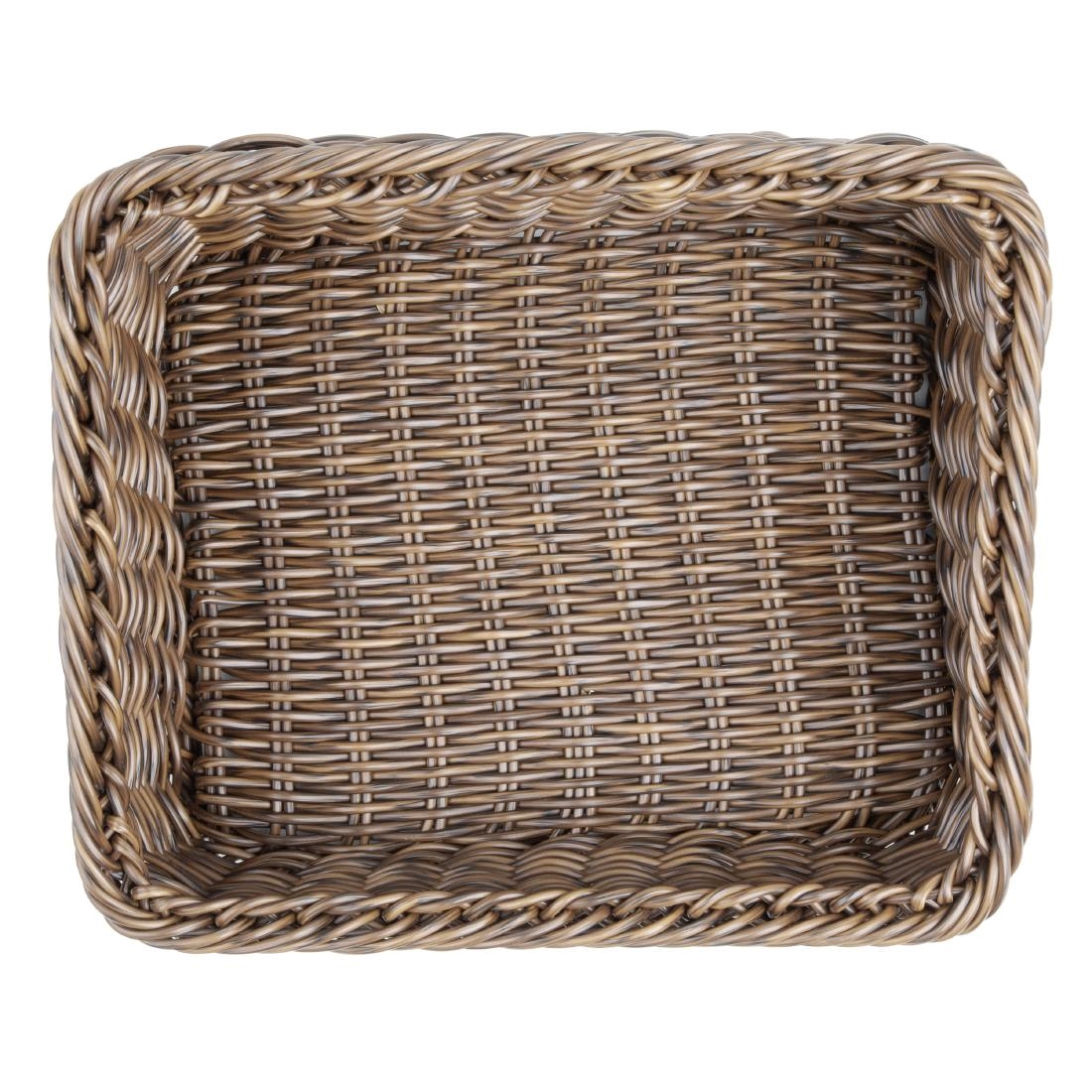 Introducing the Olympia rectangular display basket, crafted from durable polywicker in a dark brown finish. Measuring 360mm in length, it's ideal for displaying breads, pastries and other baked goods at breakfast buffets or during lunch and dinner service. The rustic, farmhouse-style design enhances the visual appeal of your food presentation, helping draw attention to what's on offer. Once service is finished, simply place the basket in the dishwasher for easy cleaning.