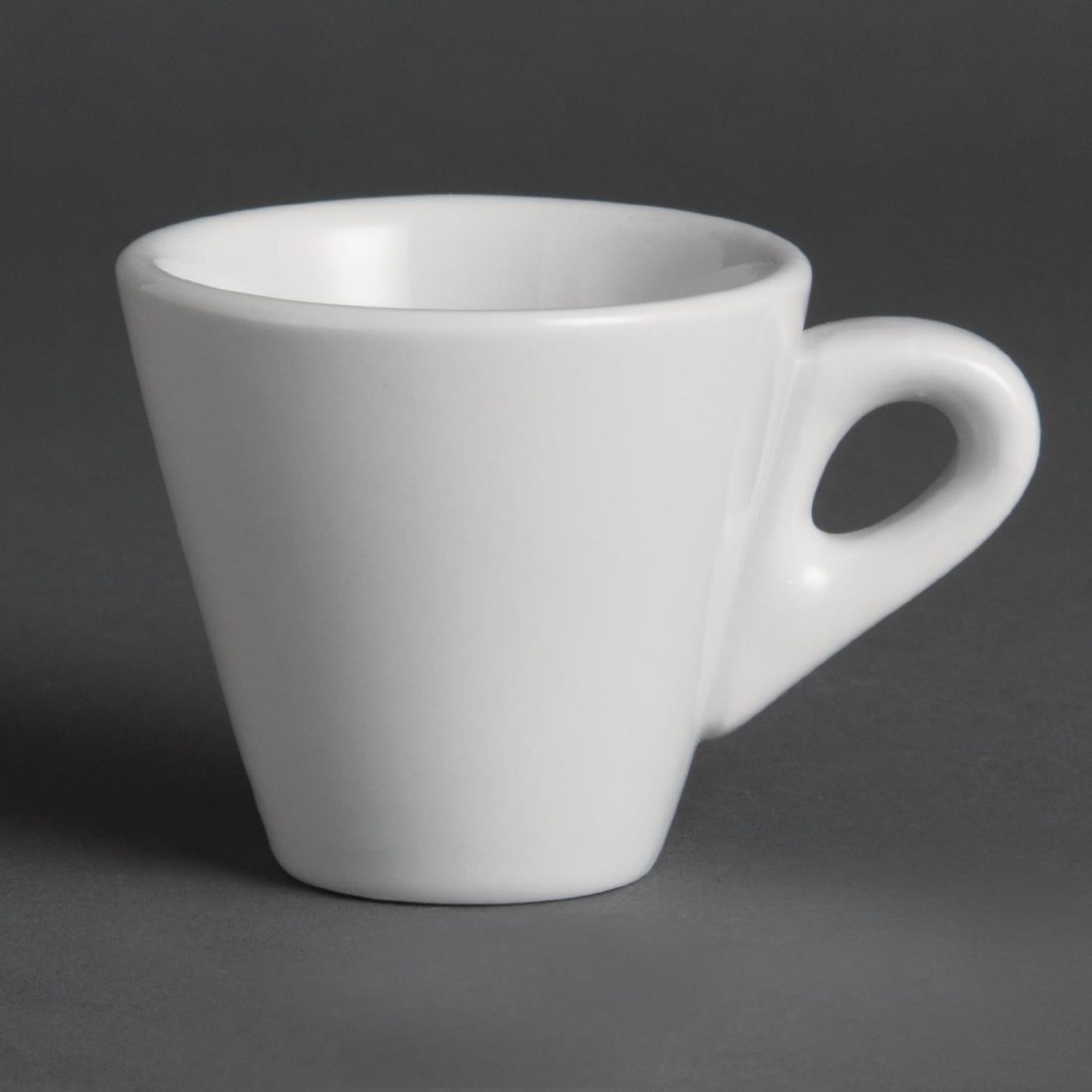 The small size 2oz espresso cup from Olympia is designed to provide a great value and durable porcelain crockery solution for busy hotels, canteens, casual dining restaurants, and cafes. Strengthened rolled edges ensure the cup is chip-resistant, and a fully vitrified body provides excellent glaze durability, making it ideal for withstanding the rigors of the professional catering environment. The cup can be stacked to help maximize storage space and is oven, microwave, dishwasher, and freezer proof.