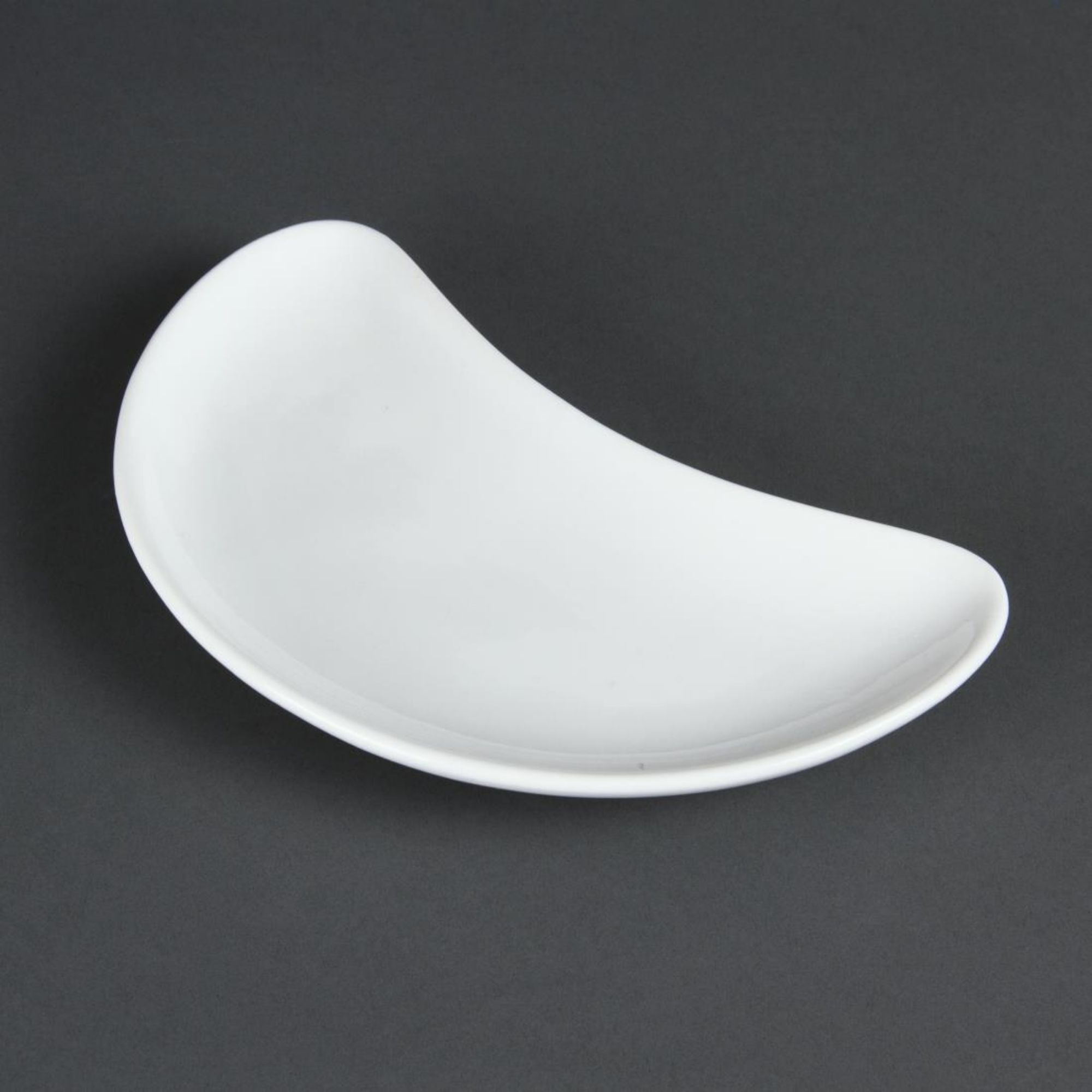 The pure white porcelain crescent-shaped salad plate by Olympia offers great value and is perfect for serving both salads and hot foods. This durable and versatile plate is easily stackable and features strengthened rolled edges for enhanced chip resistance.
