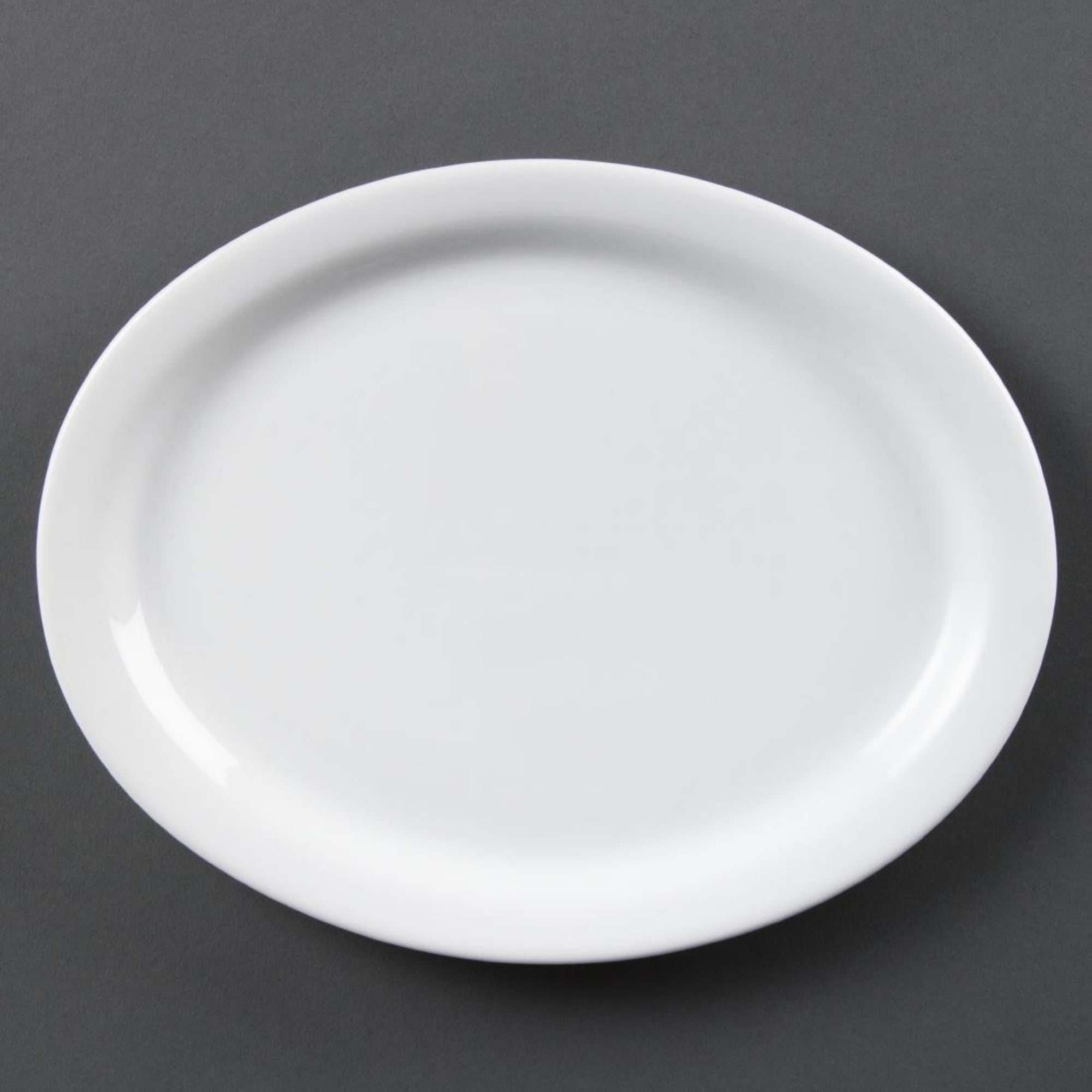 Our great value pure white oval-shaped platters by Olympia are fully vitrified for heat and shock resistance. They are the ideal crockery for hotels that desire simplicity.