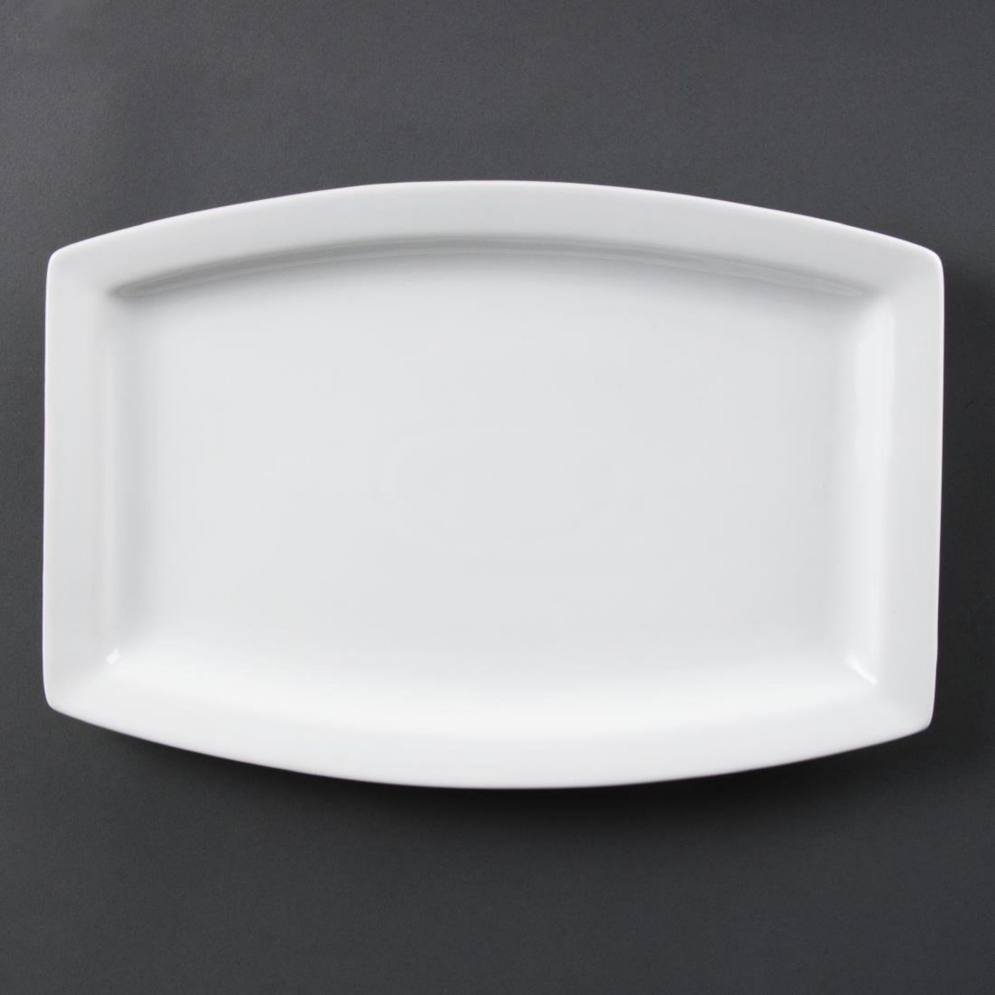 Great value hardwearing pure white porcelain rectangular plates by Olympia offer the added advantage of stackability and strengthened rolled edges for chip resistance.