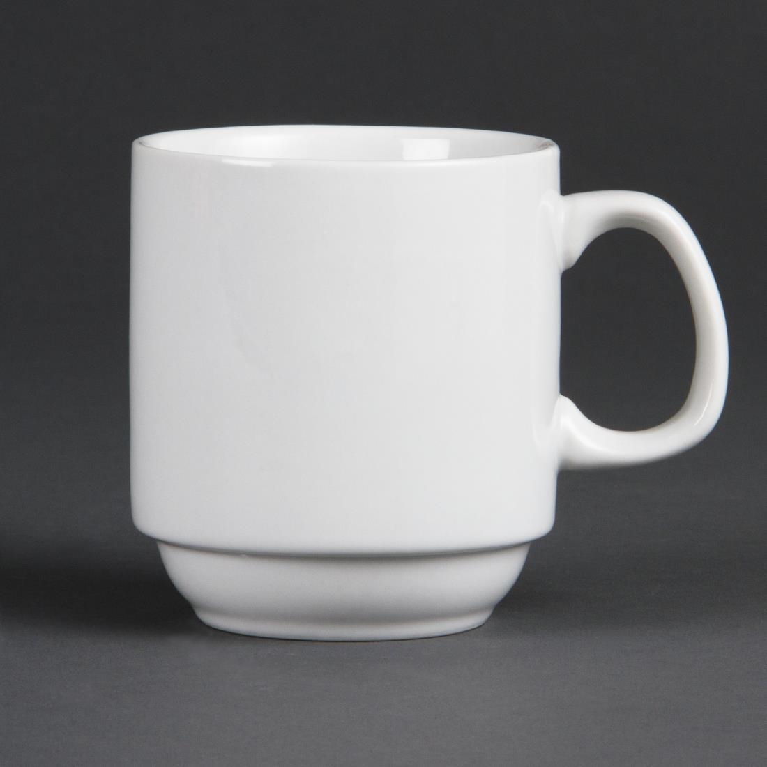 Our great value pure white porcelain stackable mugs by Olympia are fully vitrified for heat and shock resistance. They are the ideal crockery for hotels that desire simplicity.