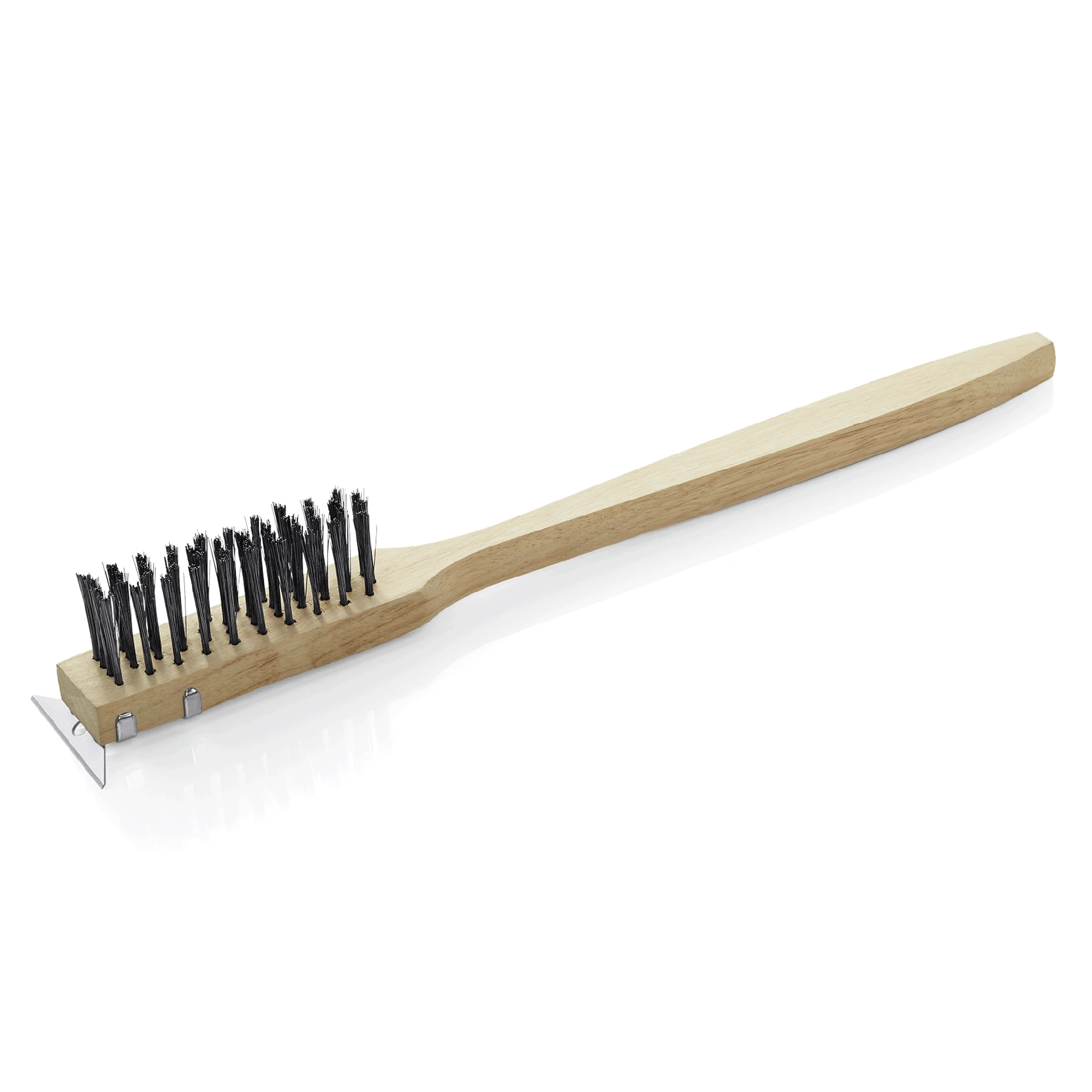 The product features bristles that are 4 cm high, arranged in 4 rows. It is equipped with steel bristles and includes a scraper that is 7 cm wide.