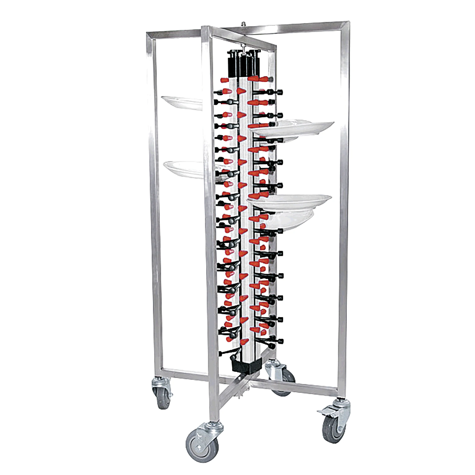 The plate rack is designed to hold up to 48 plates, providing an efficient storage solution for your kitchen or dining area. It is equipped with four swivel castors, allowing for easy mobility. Two of these castors are fitted with brakes, ensuring stability and safety when the rack is stationary.