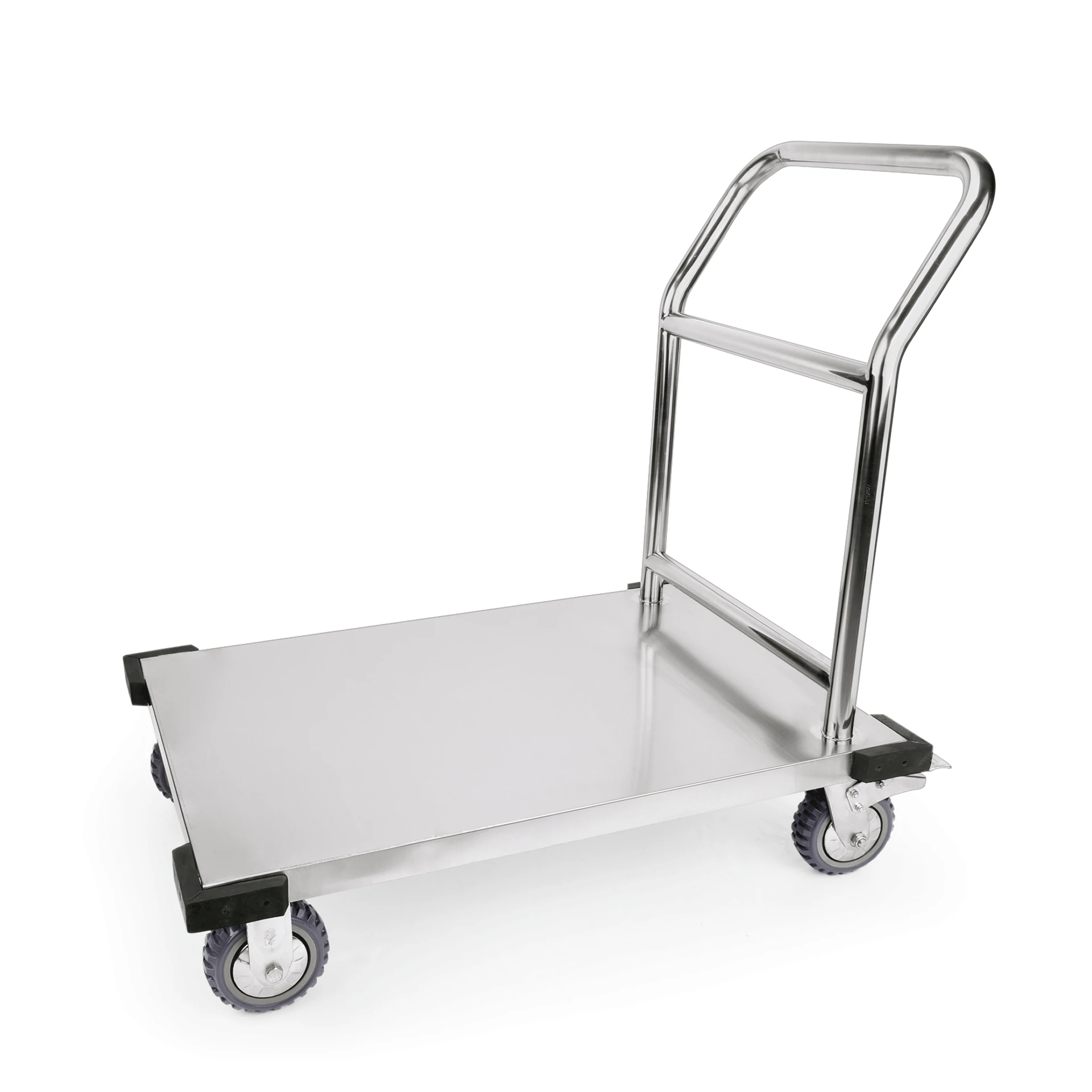 The product features a load capacity of 180 kg and a platform height of 23 cm. It is equipped with four castors, two of which are swivel with brakes for enhanced maneuverability and safety. Additionally, the design includes corner bumpers and corners with ram protection to ensure durability and protection during use.