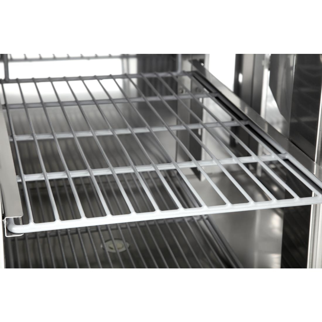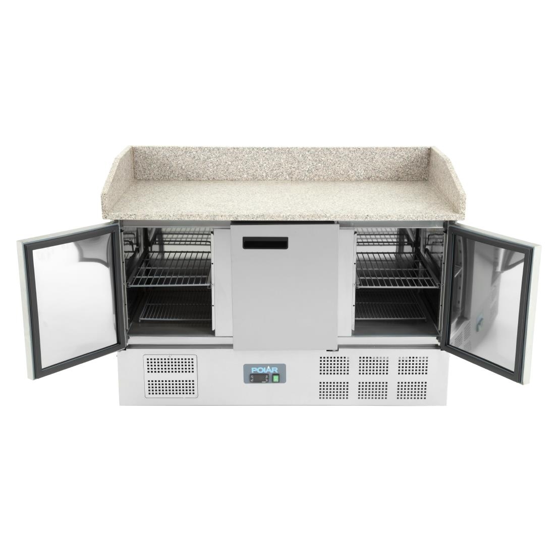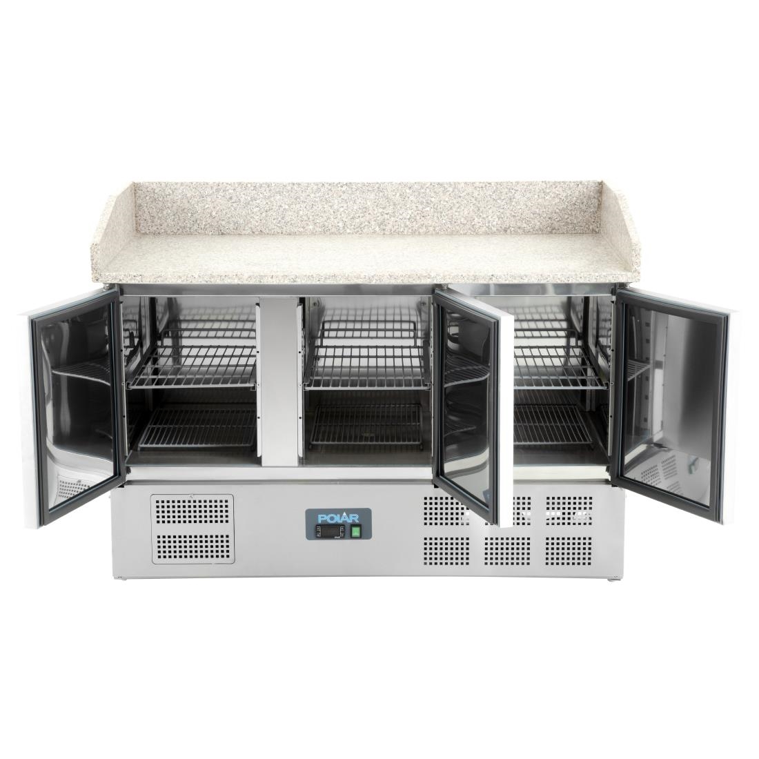 The pizza and salad prep counter features a marble work surface, providing a durable and easy-to-clean area for food preparation. It includes a refrigerated gastronorm area capable of accommodating six 1/4 gastronorm dishes, each with a depth of 150mm. Please note that the containers are not included with the counter.