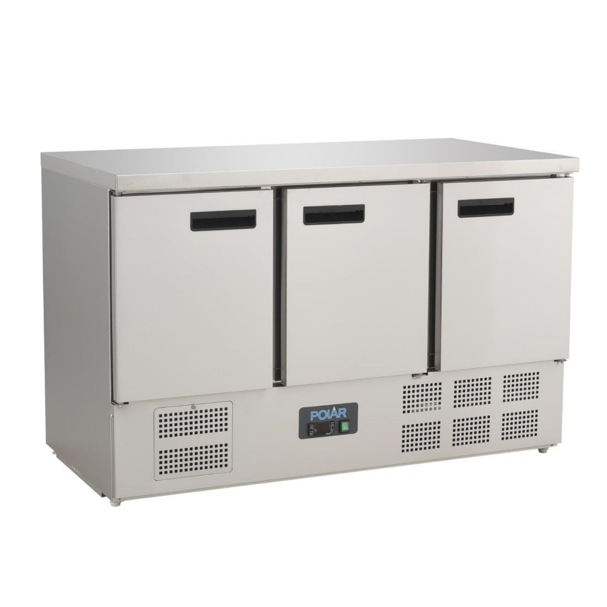 Any kitchen needing reliable chilled storage would benefit from the space-saving Polar G-Series three-door counter fridge. With simple-to-use digital controls and incredibly robust stainless steel construction, the fridge is easy to use, clean, and maintain. Strong removable door seals, self-closing doors (from 90°), and effective insulation ensure efficient money-saving operation, while the durable worktop is great for food prep or positioning smaller appliances such as microwaves, blenders, or food processors. GN pans are sold separately.