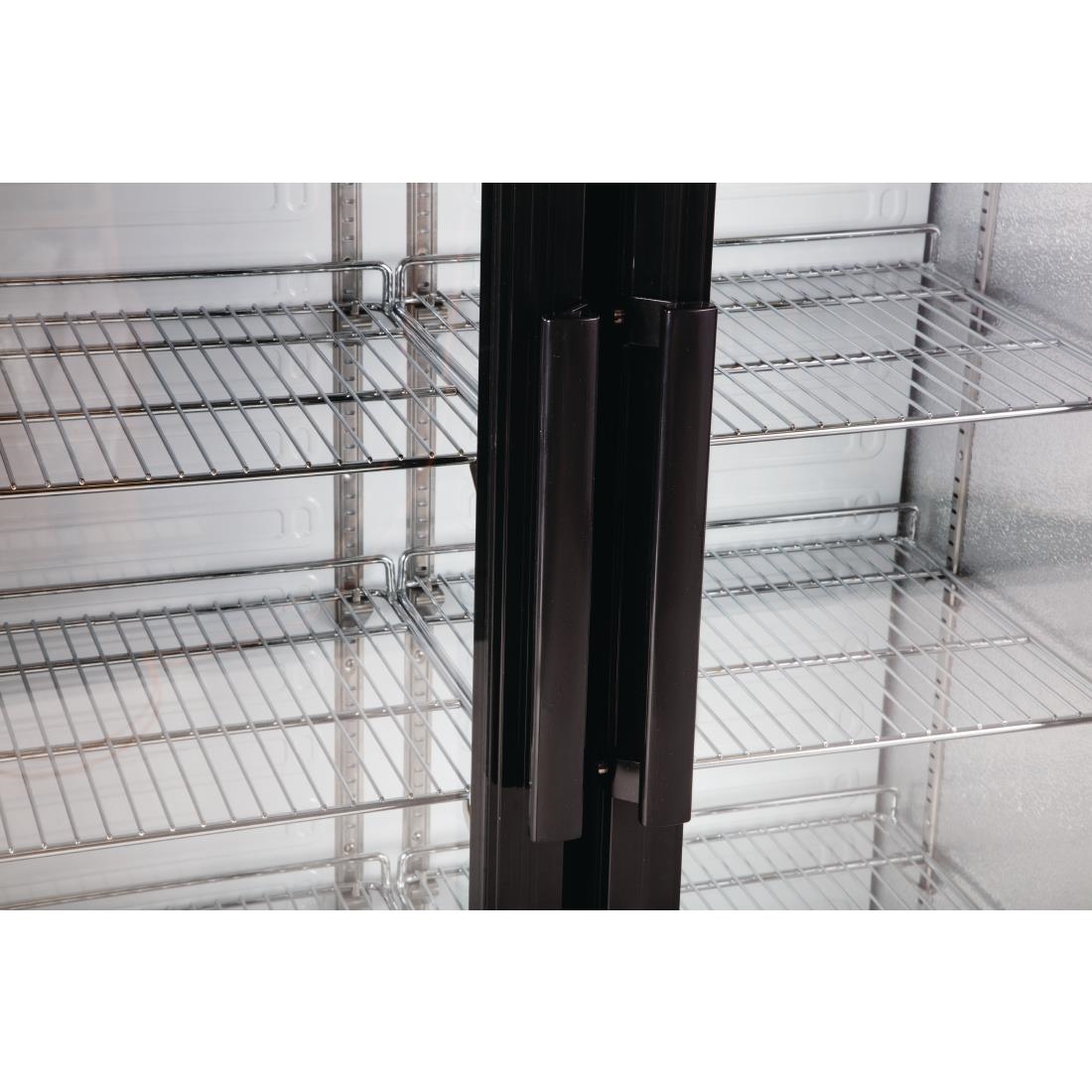 Keep your best sellers at the perfect serving temperature and stylishly merchandised with the reliable Polar G-Series upright double door back bar cooler. With eight sturdy adjustable shelves and efficient LED lighting, the fridge attractively showcases your bottles and cans, maximizing sales, especially in low ambient light bars and pubs. The hinged doors are both double-glazed and lockable, helping to reduce running costs as well as keeping the contents secure during closing hours. Cleaning is easy too, thanks to the solid commercial construction throughout and rear-mounted rollers.
