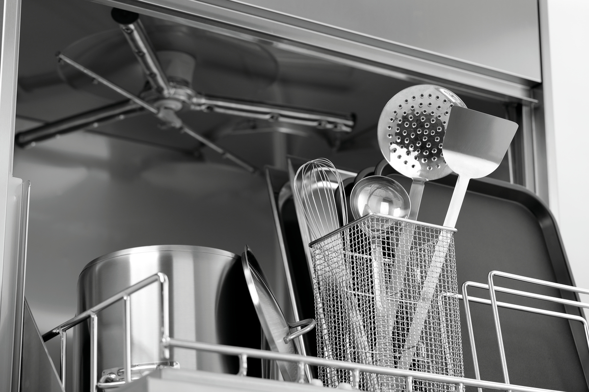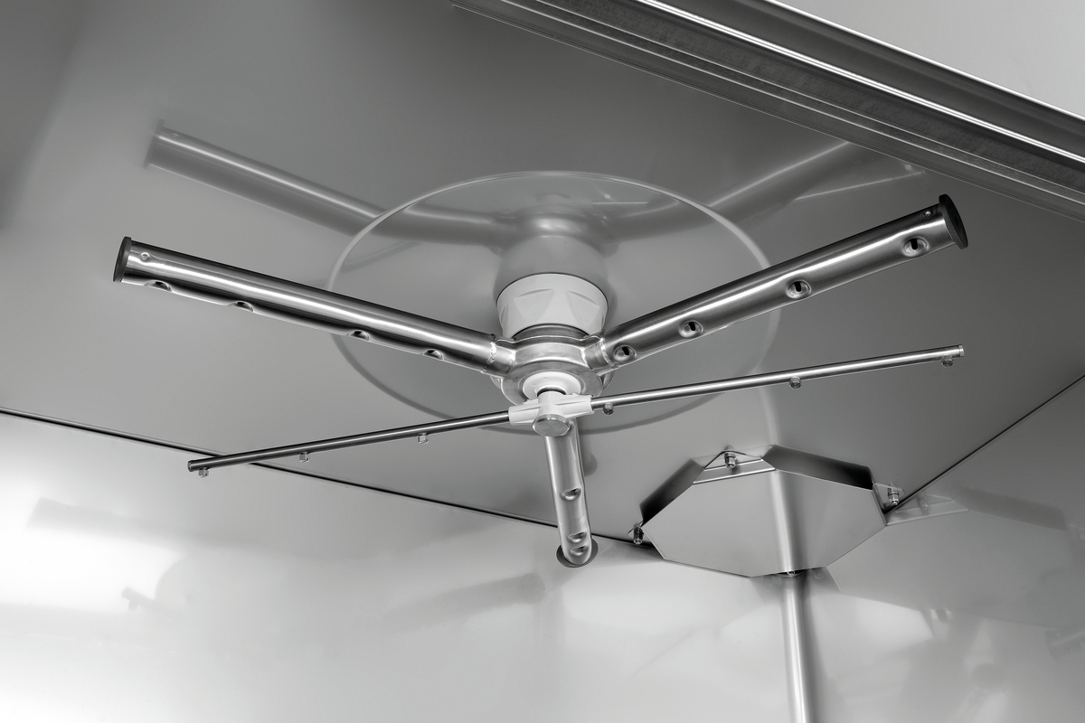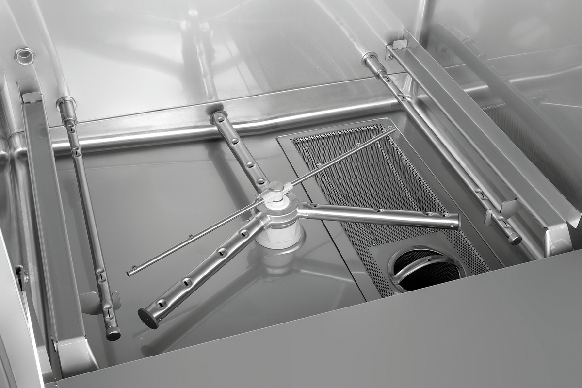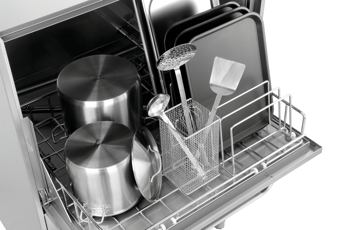 The TS 850 R, equipped with a universal basket and tray holder, is ideal for cleaning bulky items. It delivers exceptional results when washing pots, pans, trays, dishes, and bowls.