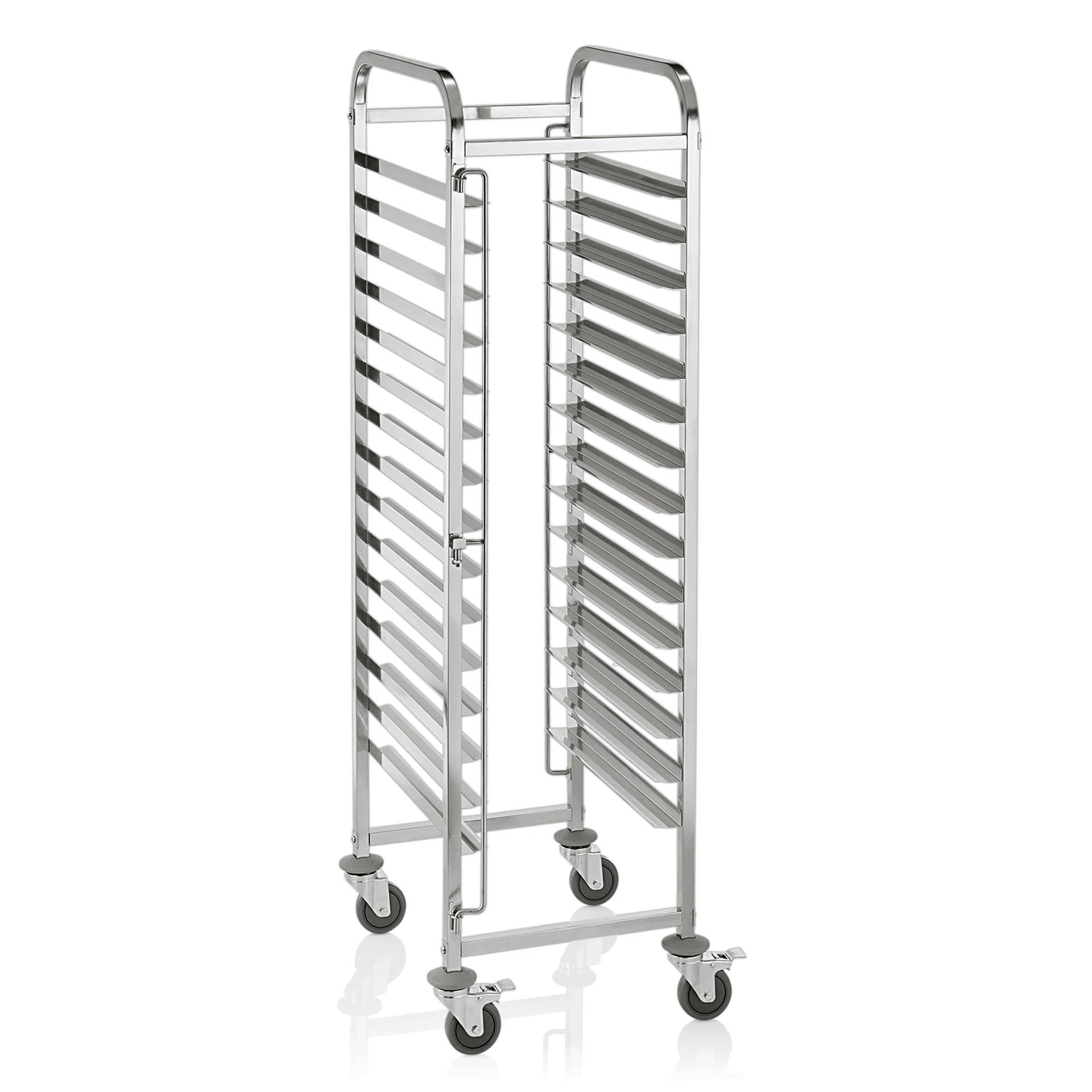 This product is designed to accommodate 15 baking sheets, each measuring 60 x 40 cm. It is equipped with four swivel castors, each with a diameter of 12 cm. The castors include bumpers for added safety, and two of them are fitted with brakes to ensure stability. Additionally, the product features a safety catch to prevent containers or trays from slipping out, providing a secure and efficient solution for your baking needs.