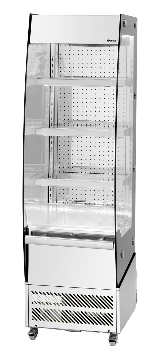 The mobile refrigerated wall shelf is designed for the presentation of goods across four levels. It features three height-adjustable shelves, allowing for individual and needs-based assembly.
