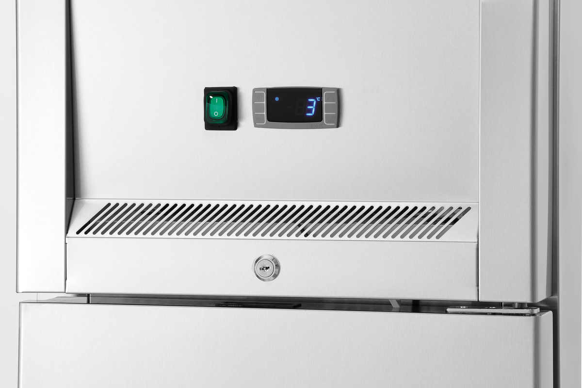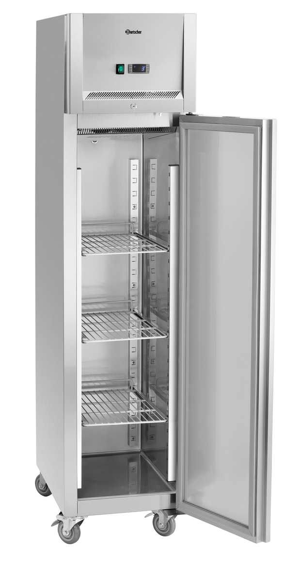 The Gastronorm refrigerator is designed with 4 swivel castors, making it particularly space-saving due to the lengthwise insertion of the shelves. The height-adjustable shelves provide ample space for 1/1 GN and 1/2 GN prepared containers.