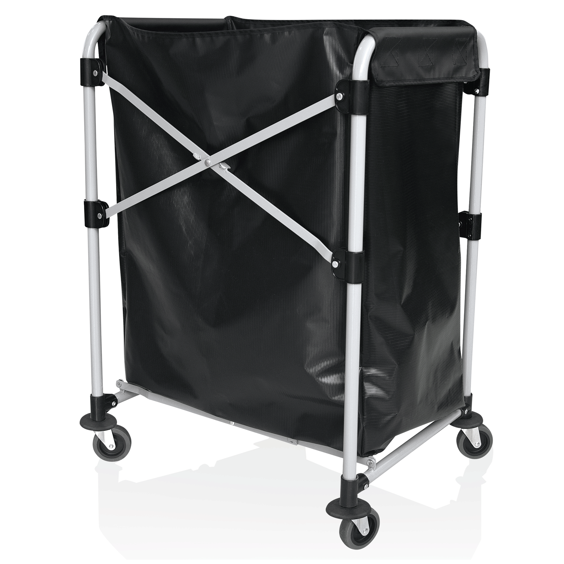 This replacement laundry bag is designed for use with 4434 150 and 4434 1524 swivel castors. It features two castors equipped with brakes for added stability. The laundry bag is collapsible, making it convenient for storage when not in use. Constructed from durable vinyl, it ensures long-lasting performance. The frame is made from powder-coated iron, providing a sturdy and reliable structure.