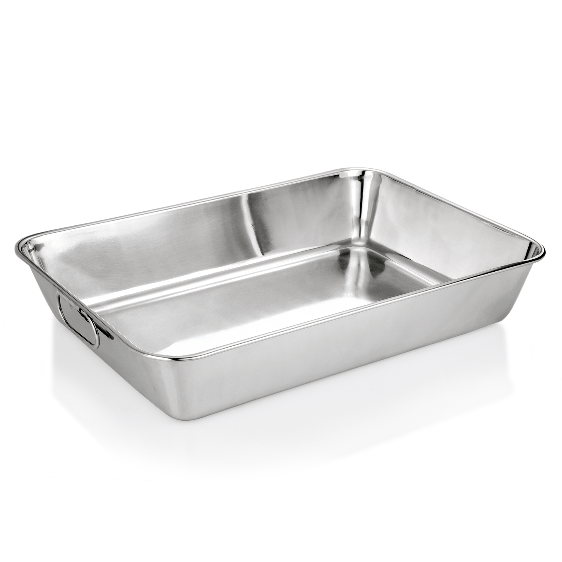 This product features drop handles and a rolled rim. It does not include a sandwich base and is not suitable for use on hobs.