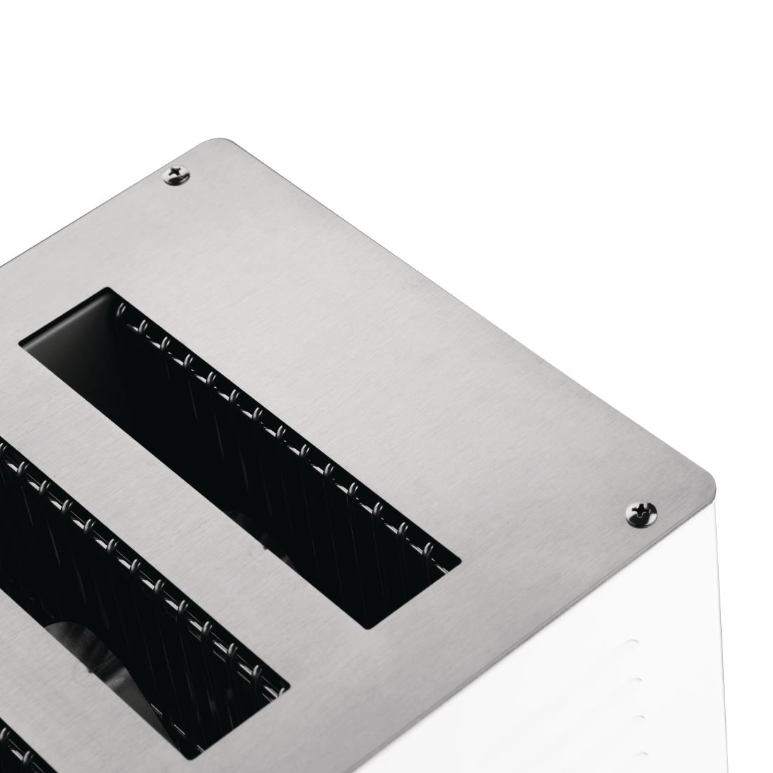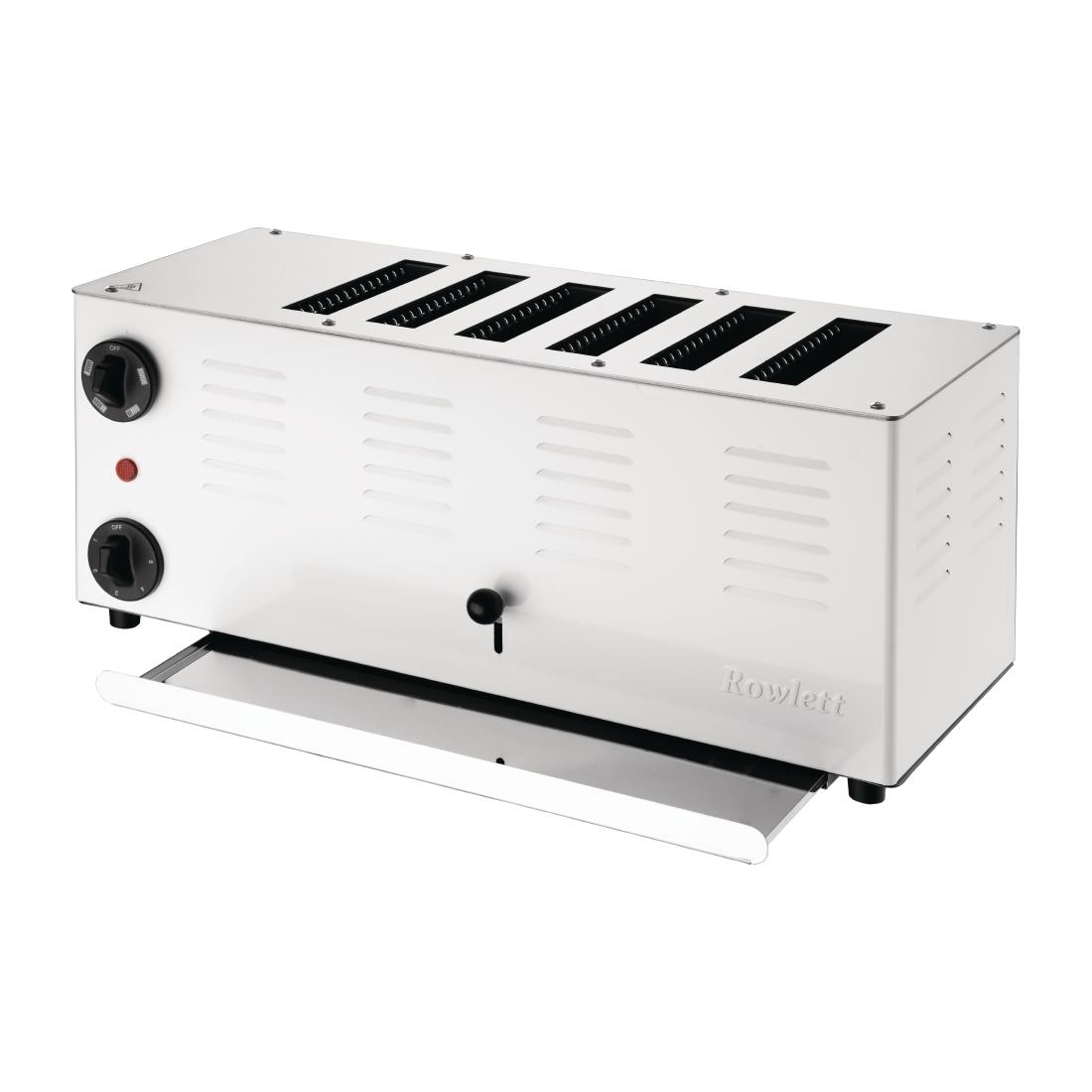 The highly robust and practical Rowlett Rutland Regent 6 Slice Toaster 6ATW-131 from Rowlett Rutland's long-established toaster range offers a variety of features. It includes a stainless steel top and a durable powder-coated body, making it ideal for use in pubs, restaurants, hotels, schools, and care homes. Each slot is equipped with a separate timer, allowing for versatility and optimum energy efficiency, as only the required slot heats up.