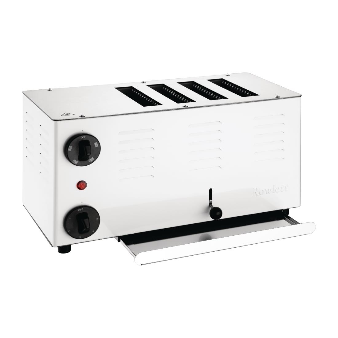 The highly robust and practical Rowlett Rutland Regent 4 Slice Toaster 4ATW-131 from Rowlett Rutland's long-established toaster range offers a variety of features. It includes a stainless steel top and a durable powder-coated body, making it ideal for use in pubs, restaurants, schools, B&Bs, and care homes. The toaster is fitted with a slot selector switch, allowing for versatility and optimum energy efficiency, as only the required slot heats up. It also switches off at the end of each cycle, signaled by a 'toast ready' ringer, but keeps the toast warm in the machine until taken out. This toaster is suitable for thicker products such as hand-cut bread or crumpets.