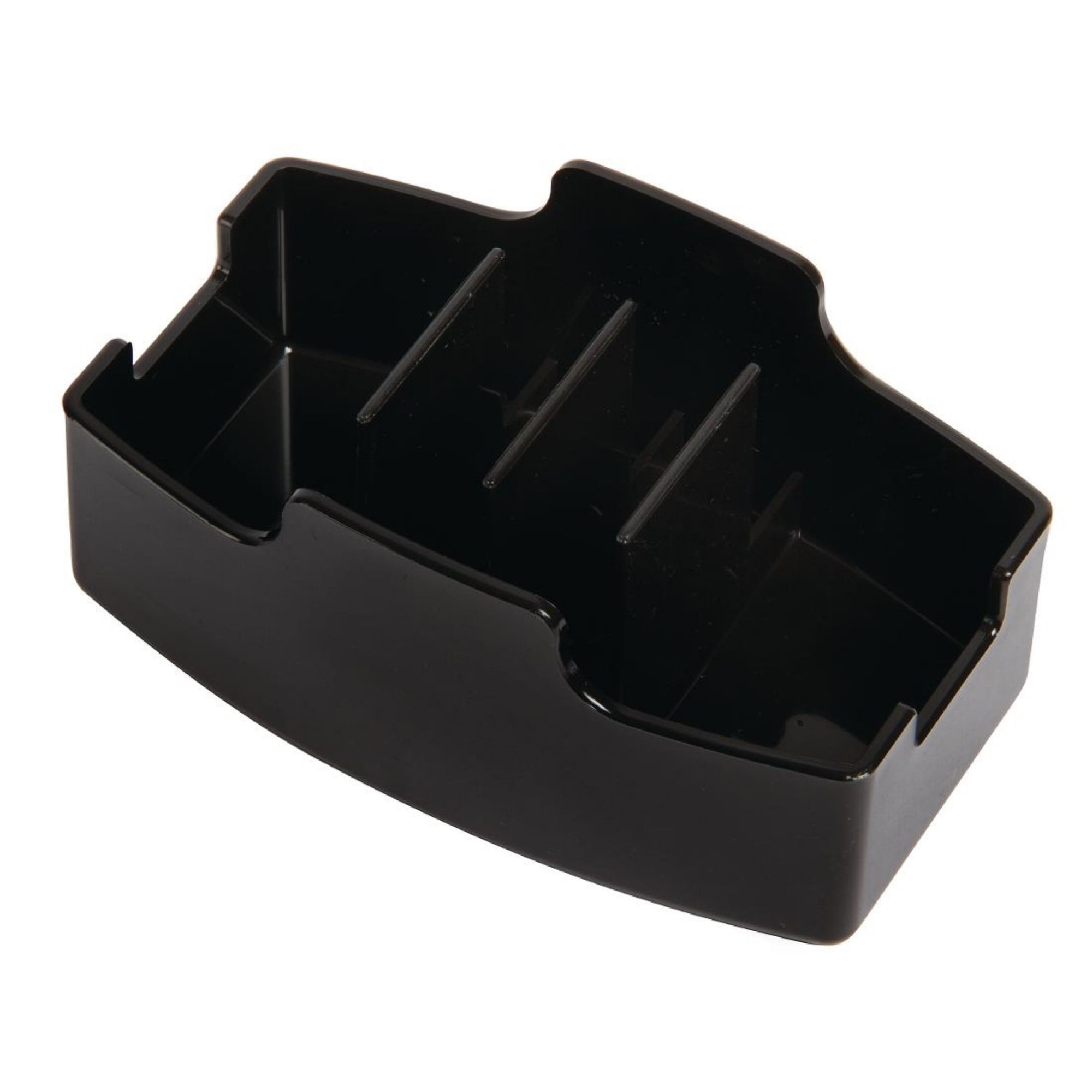 The Sachet Holder in Black offers a simple and effective way to keep tea, sugar, or drink stirrers neat and tidy. Made from durable polycarbonate plastic, the holder is both easy to clean and long-lasting, saving you time and replacement costs. Rubberized feet ensure that the holder stays in place and prevents slippage. Capable of holding multiple sachets at a time, this holder is the perfect addition to any café, bar, or hotel service.