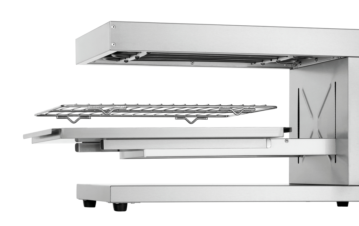 Gratinate, grill, and keep food warm as you continue working for a workflow without interruptions. When the salamander is placed on a countertop, the two long open sides of the salamander allow practical service from both sides in kitchens and service areas.