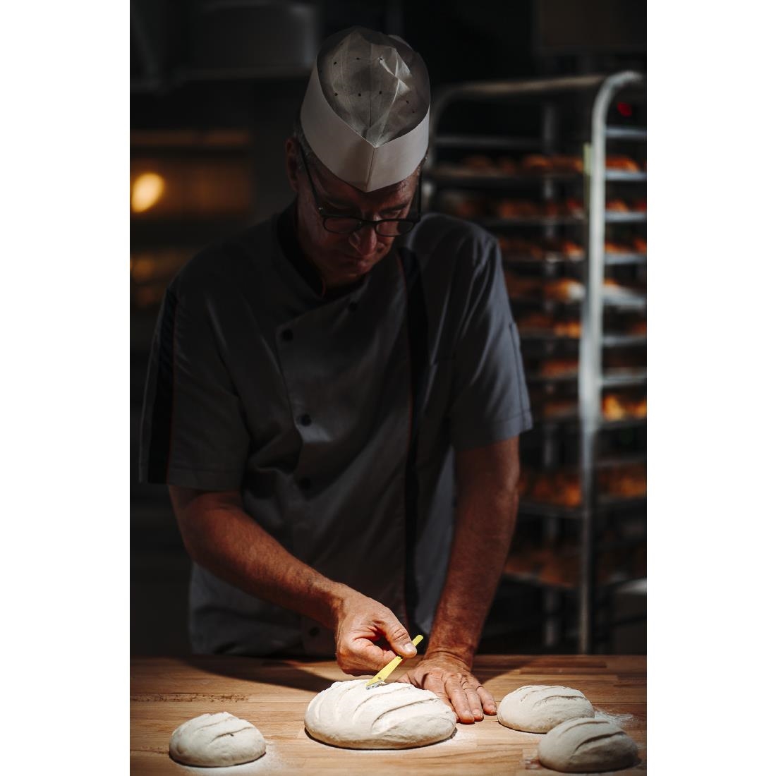 This high-quality grignette blade features an ergonomic light green handle for comfortable use and a stainless steel blade that ensures clean, consistent cuts. Ideal for achieving perfect grigne, the Ergo grignette blade is a must-have for creating artisan bread with professional aesthetics and texture. The added lug onto the handle allows for a better grip from a flat surface.