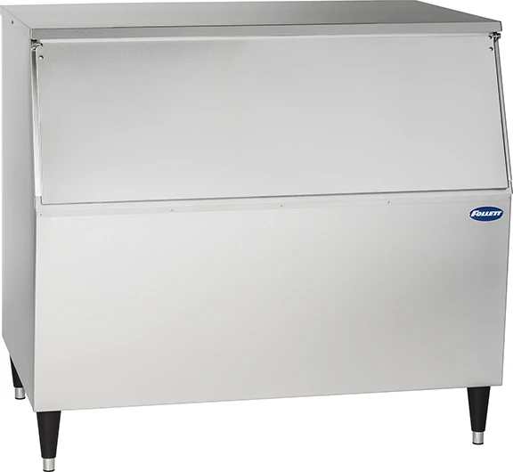 Slope front bins are designed with insulated interiors and finished with rounded corners to facilitate daily turnover of ice. They are easy to clean and maintain, featuring removable gaskets for convenience. Reinforced hinges enhance durability, while the slope front design ensures easy access to ice.