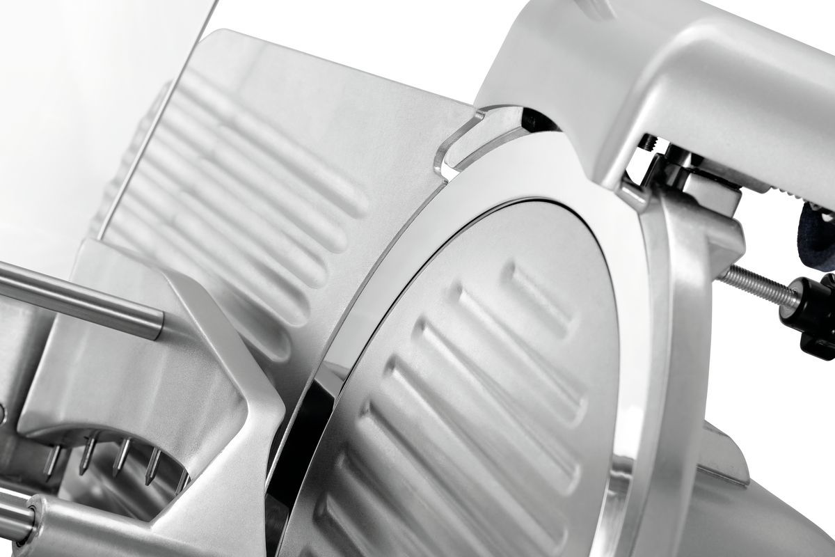 The design of the optimized slicing machine, featuring a 220 mm blade, stands out due to its numerous technical features. This high-performance oblique slicer is available in five different sizes and includes a holder for remainders, a blade sharpener, a cutting guide, and a two-fold blade guard. Additionally, it is equipped with a solenoid switch to ensure safety.