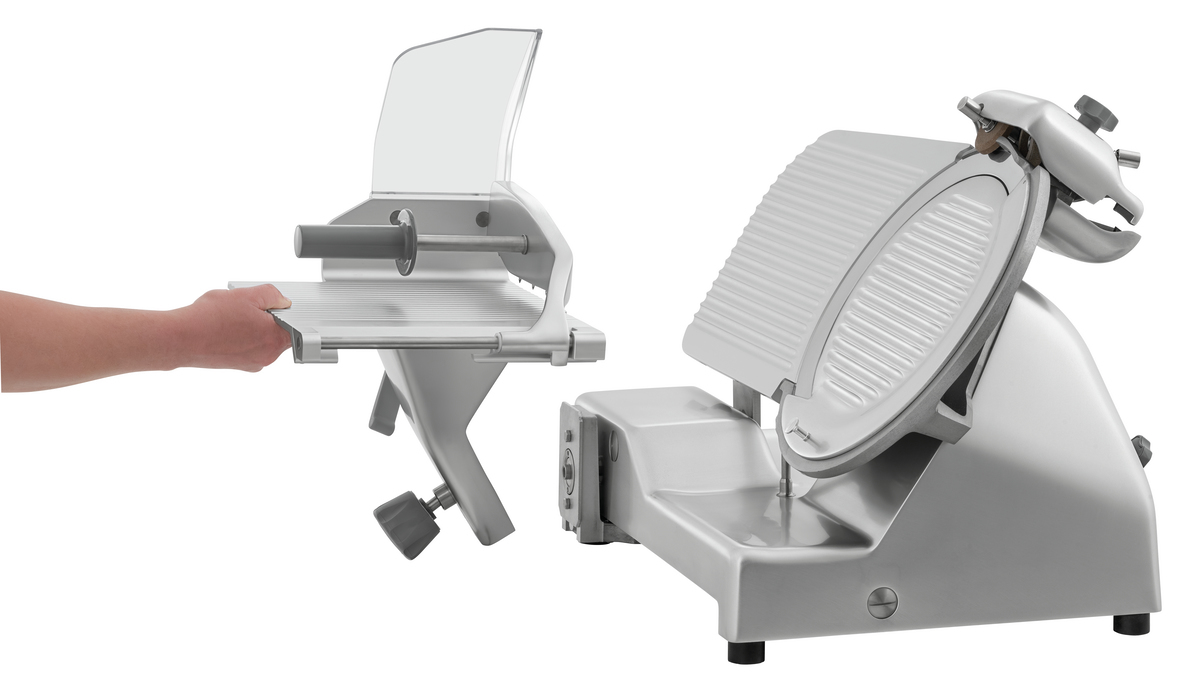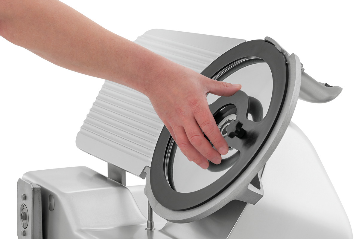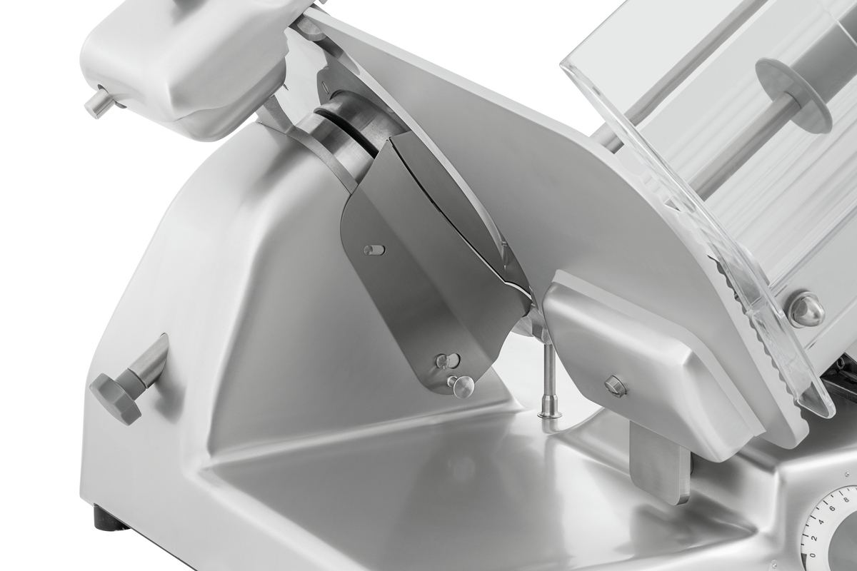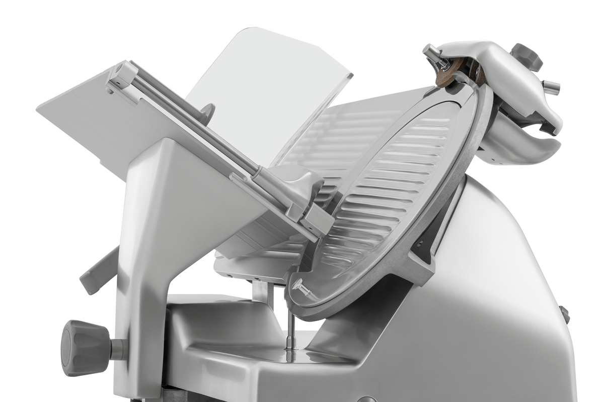 The motorized slicer is a powerful and low-maintenance tool designed for demanding use in large kitchens and butcher shops. It is specifically engineered for cutting cheese and cold meats efficiently.