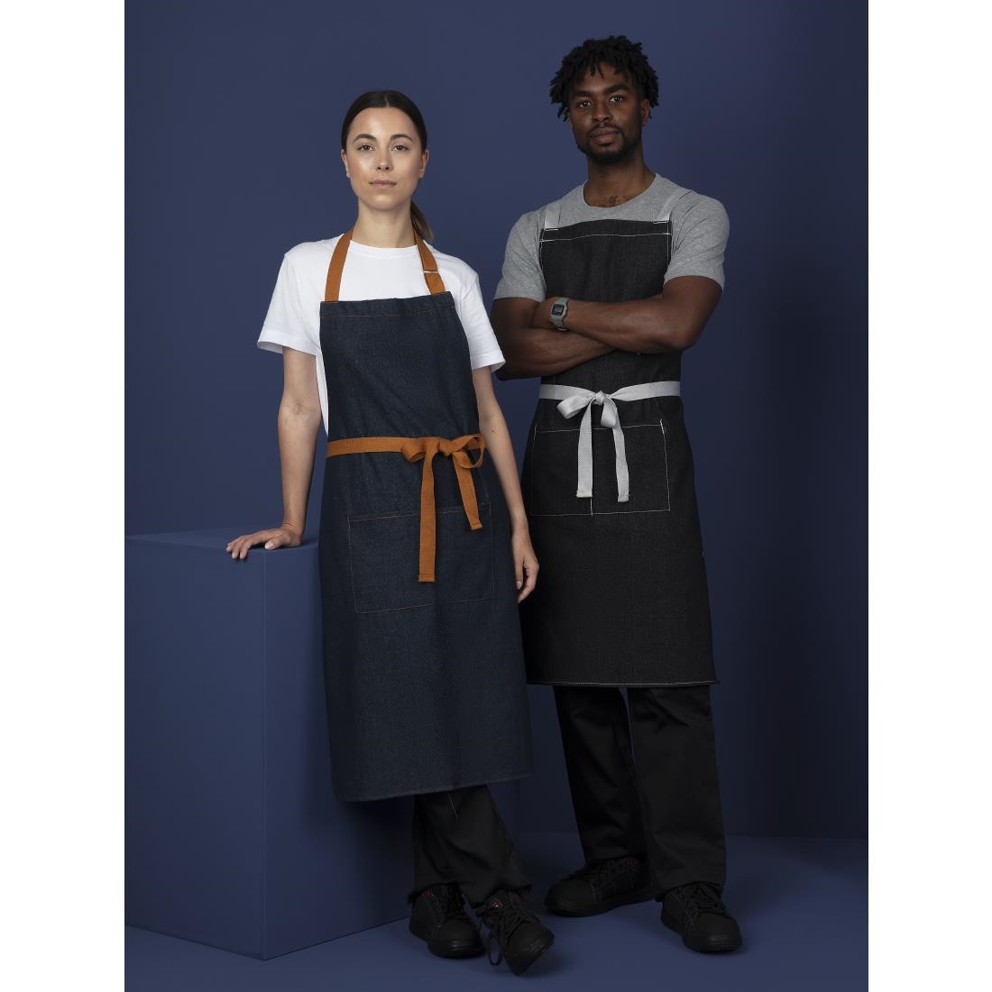 The modern polycotton bib apron is designed with a double front pocket, providing convenience and functionality. It offers full-length coverage to ensure the protection of clothing and uniforms.