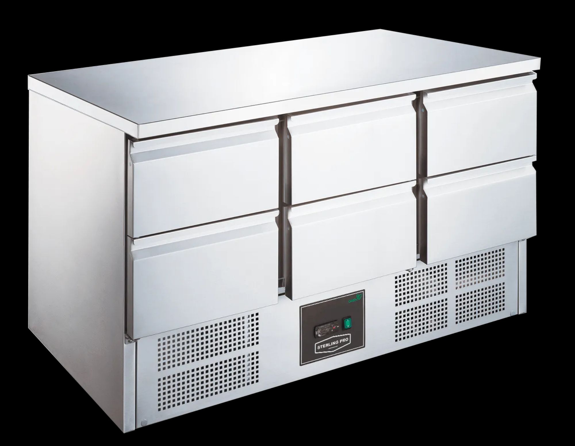The Sterling Pro SPU303-6D refrigerated counter is designed to keep your fresh ingredients safely chilled without being environmentally costly. This 6-drawer design offers a substantial amount of internal chilled storage space, along with the added benefit of over 1350mm of prep space on top.