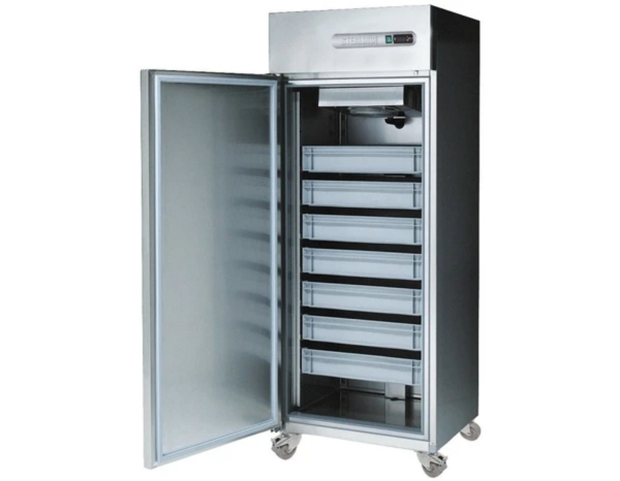 The Sterling Pro SPF-071 is a fish fridge with a unique drainage system that helps keep the fish as fresh as possible while making cleaning straightforward. It comes equipped with seven fish boxes and a Carel Controller. Its epoxy-coated anti-corrosion evaporator is specifically designed to withstand the additional pressures this storage faces. Consistent with the main range of Sterling Pro Refrigeration, the SPF-071 features stainless steel construction inside and out, along with a self-closing door and replaceable gasket.
