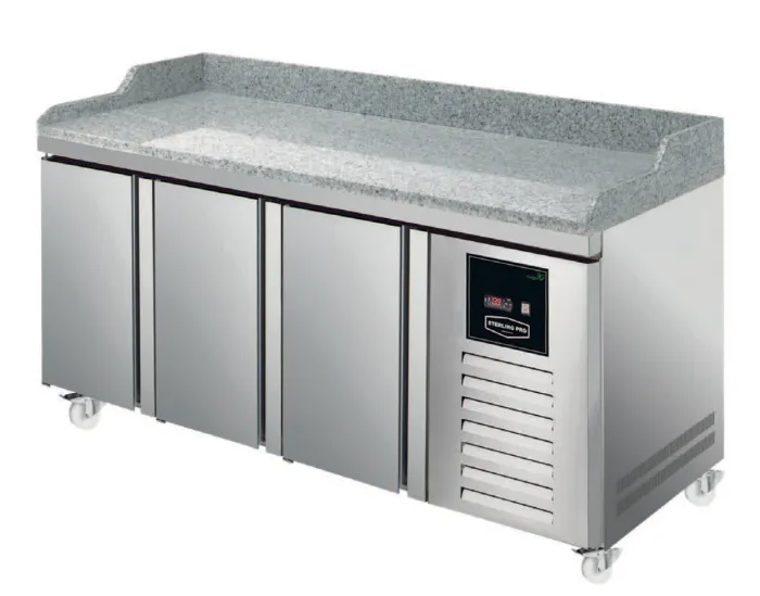 The Sterling Pro Green SPI-7-135-20-GR Two Door Granite Counter Fridge is designed with a heavy-duty 30mm granite worktop, featuring side splash-backs and a rear splash-back that is 250mm high. This design effectively prevents spillage behind the counter.