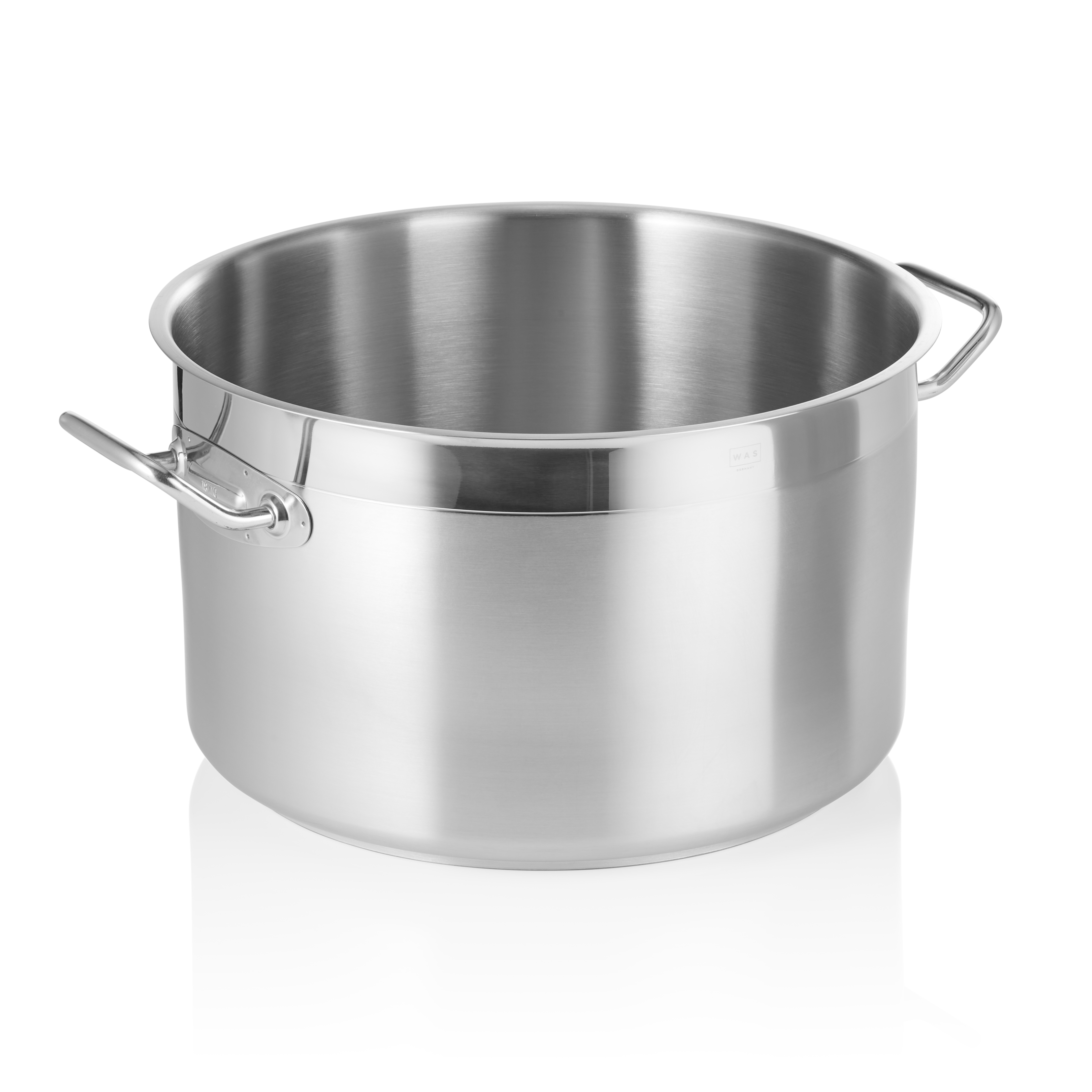 The sandwich base has a thickness of up to 7 mm and includes a pouring rim. It features riveted or welded on stay-cool handles, ensuring safe and comfortable handling. The pots, with a diameter of up to 50 cm, are suitable for induction cooking.