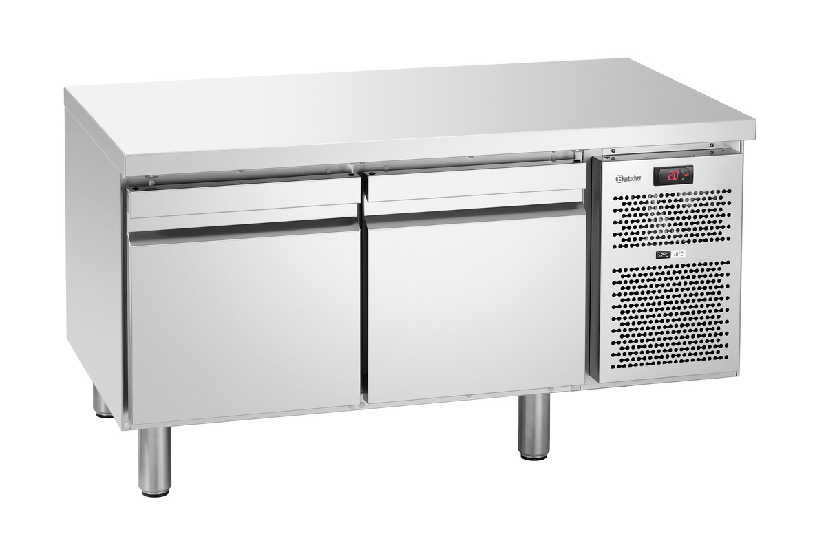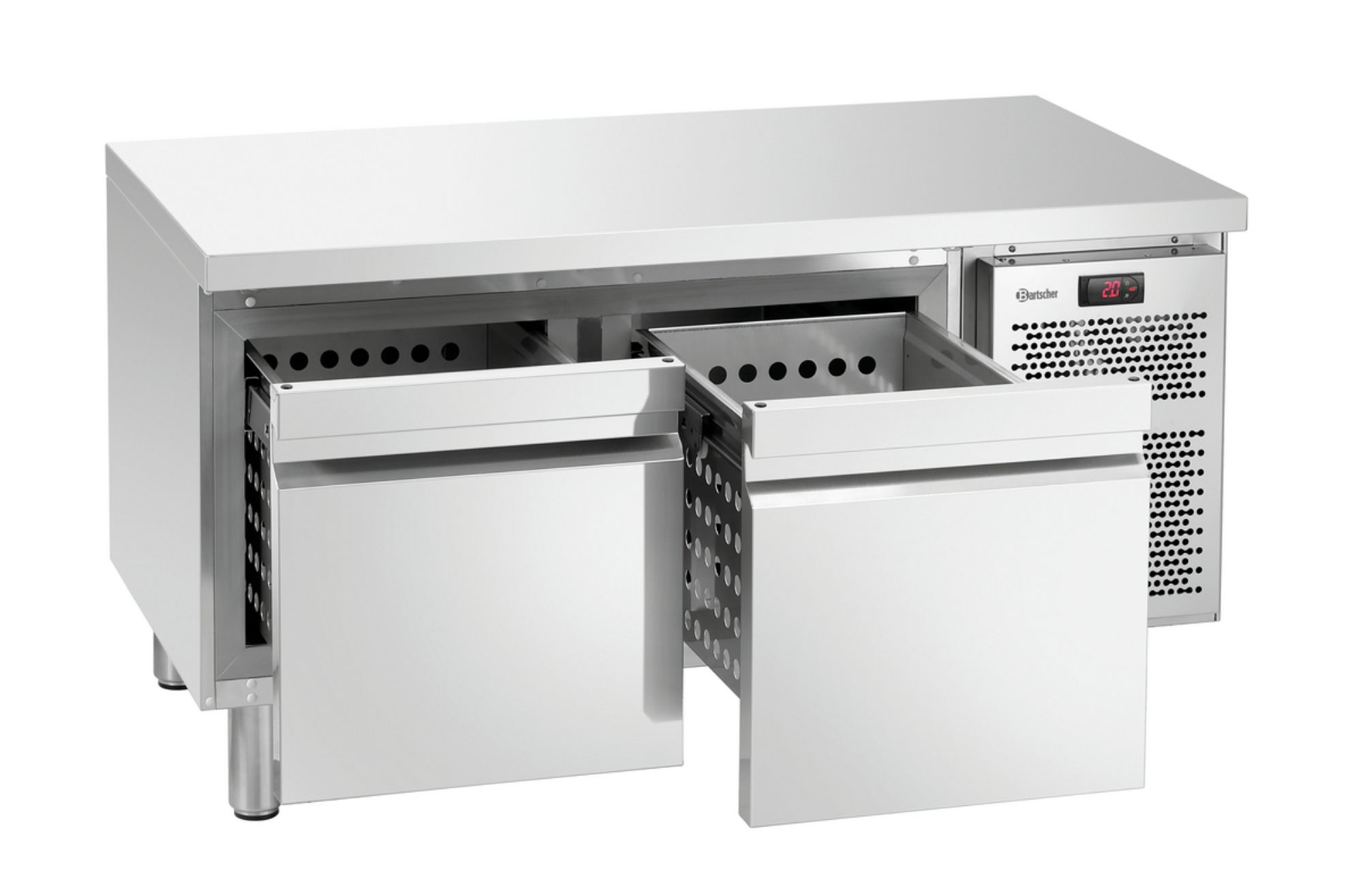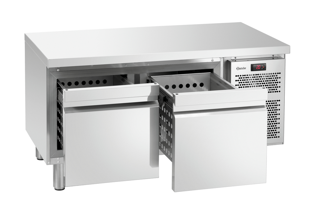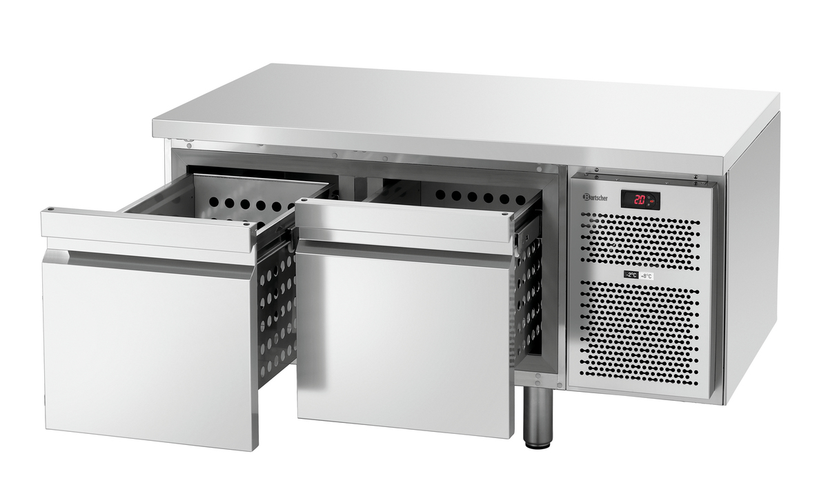 This chiller features two large drawers designed to accommodate GN containers with a depth of up to 200 mm. It is suitable for installation under the kitchen work surface. With a temperature range of -2°C to +8°C, it is capable of keeping a variety of different foods cool.