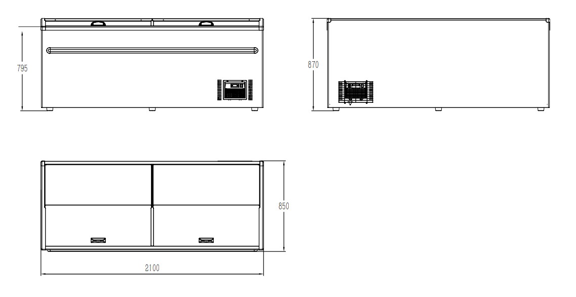 This chest freezer combines a sleek design with practical functionality. Equipped with glass sliding lids for optimal product visibility and easy access, static cooling, automatic defrost, and energy-efficient LED lighting. The digital controller allows for easy temperature adjustment, while the generous 850-liter interior provides maximum storage capacity. Dimensions are 2100x850x870 mm (WxDxH) – power consumption 0.7 kW – temperature range -22/-18ºC – weight 113 kg.