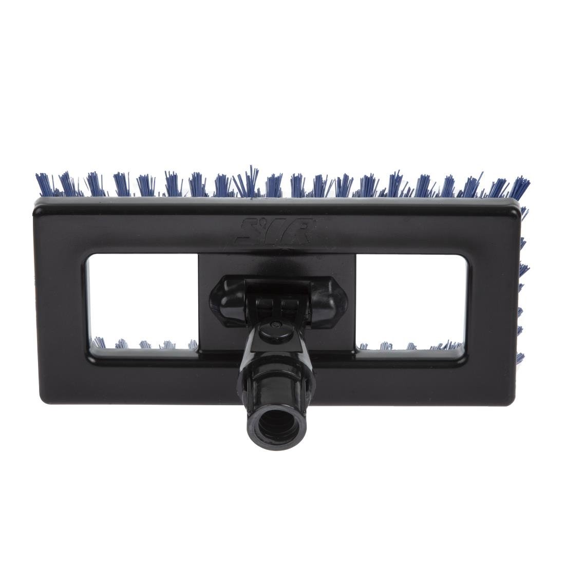 The deck scrubber features a durable polypropylene base and stiff bristles, designed for effective cleaning.