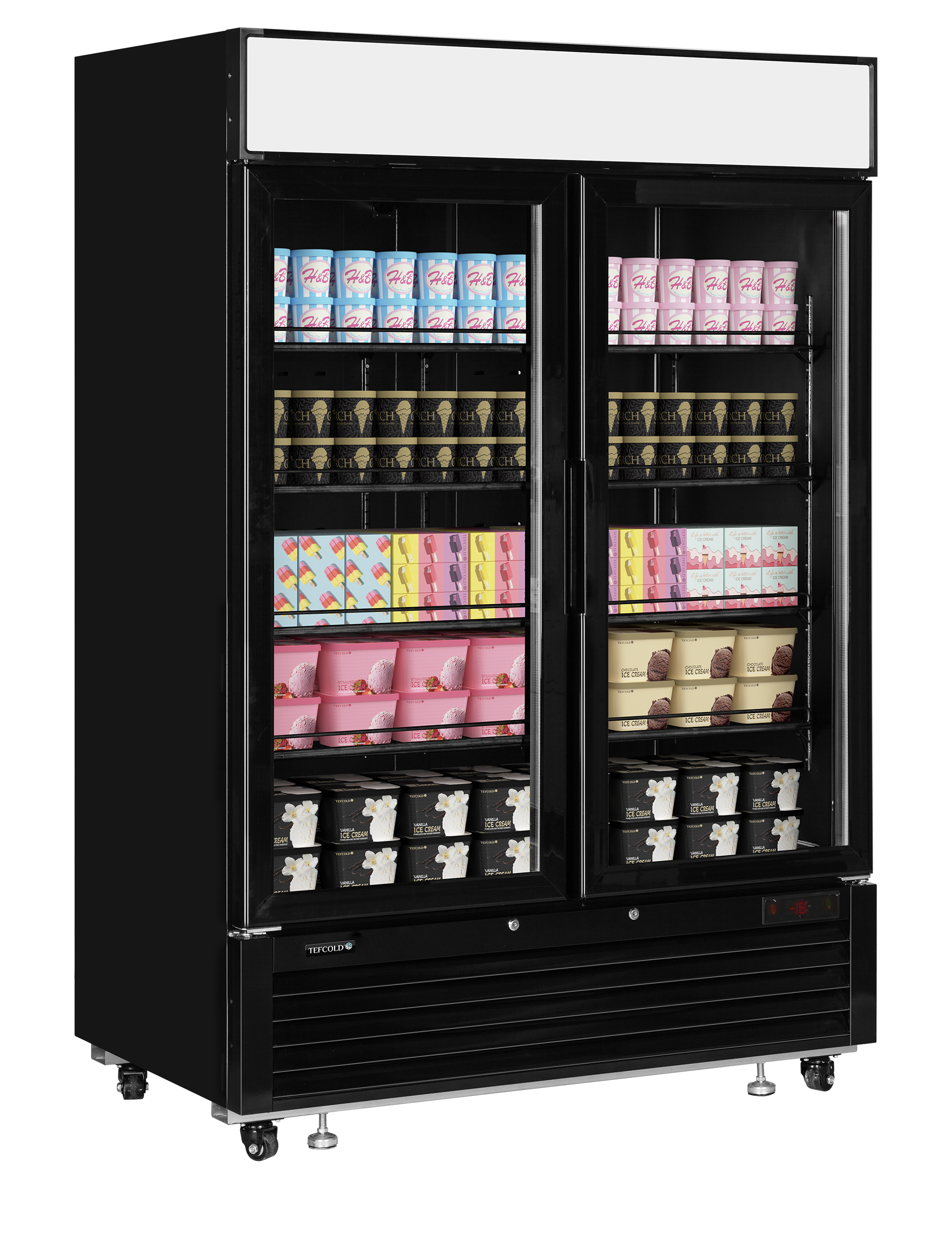 The LGF5000 is available in a sleek black finish, making it an excellent choice for establishments seeking a sophisticated and high-quality aesthetic. Each door boasts two vertical LED light strips, drawing attention to the product on display. The refrigeration system is highly energy-efficient, minimizing operational costs while keeping your products at their optimal temperature.
