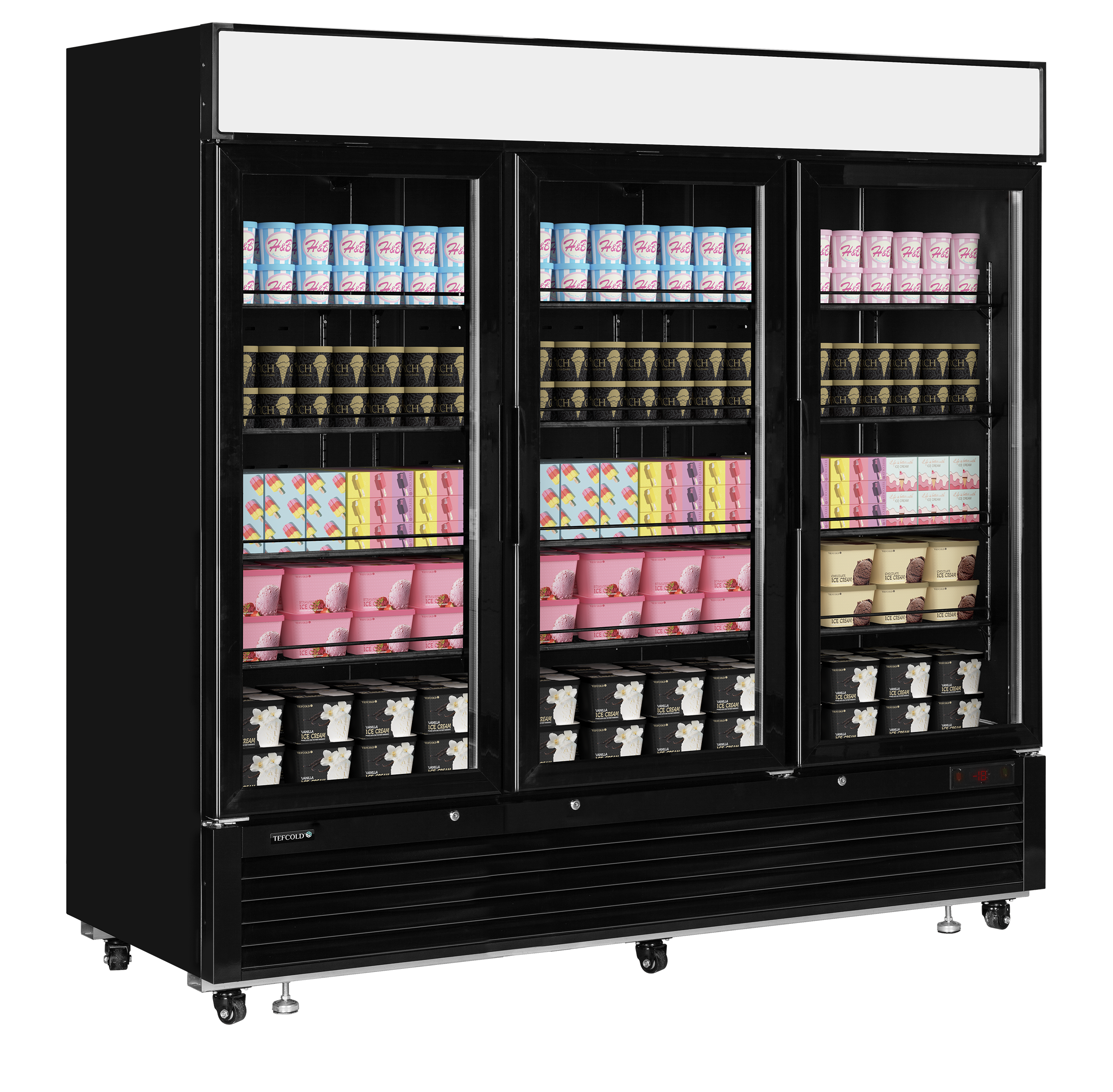 The TEFCOLD LGF range offers single, double, and triple door glass freezers with matching chiller versions. Each freezer features vertical LED light strips, a large LED light canopy, and a stainless steel base for easy cleaning. The energy-efficient refrigeration system helps keep operational costs low. Equipped with castors and locking feet, these versatile and quality units are perfect for frozen foods and ice cream.