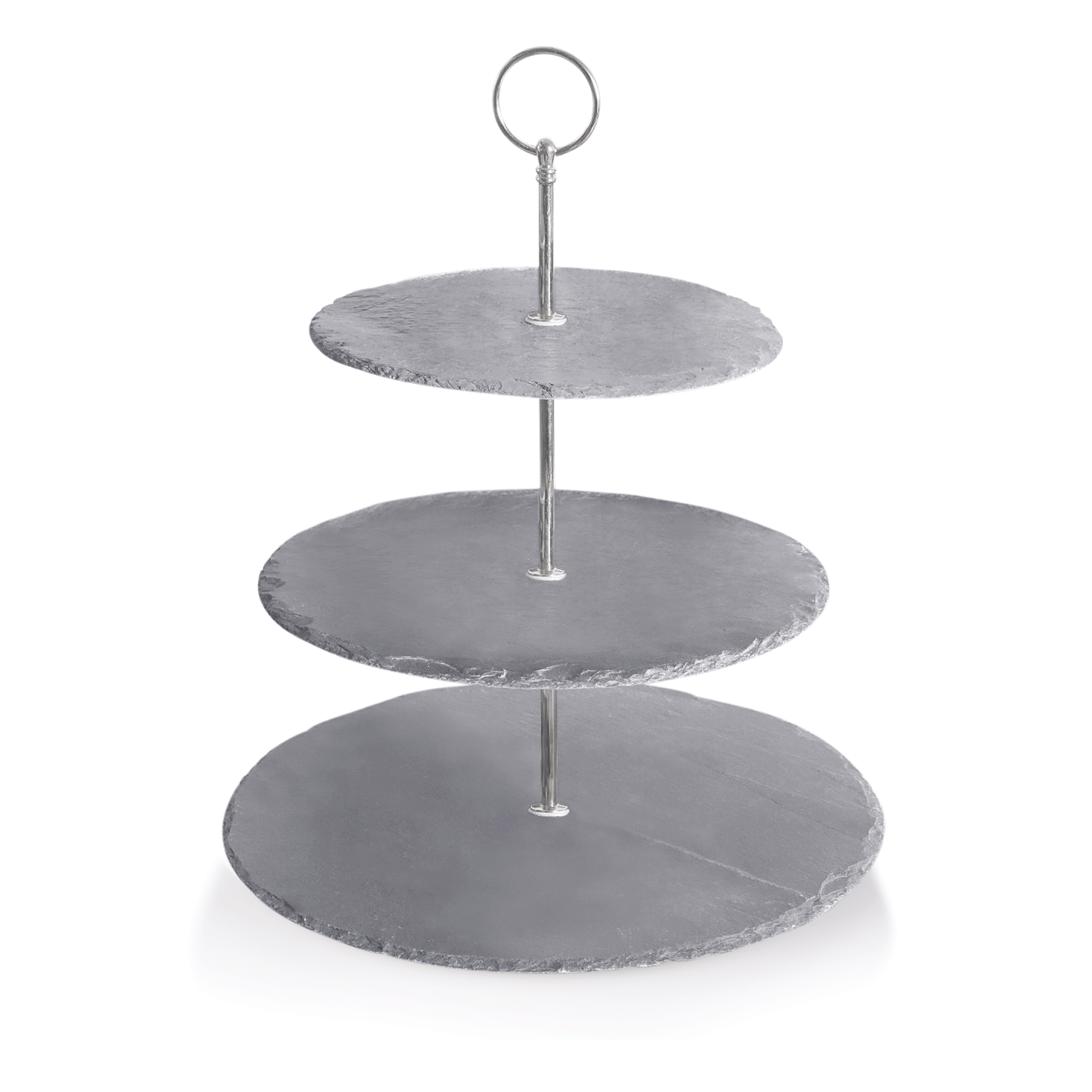 This product features a 3-tier design with platforms measuring 20 cm, 25 cm, and 30 cm in diameter. Made from natural slate, the dimensions of each platform may vary, adding a unique touch to the overall aesthetic.