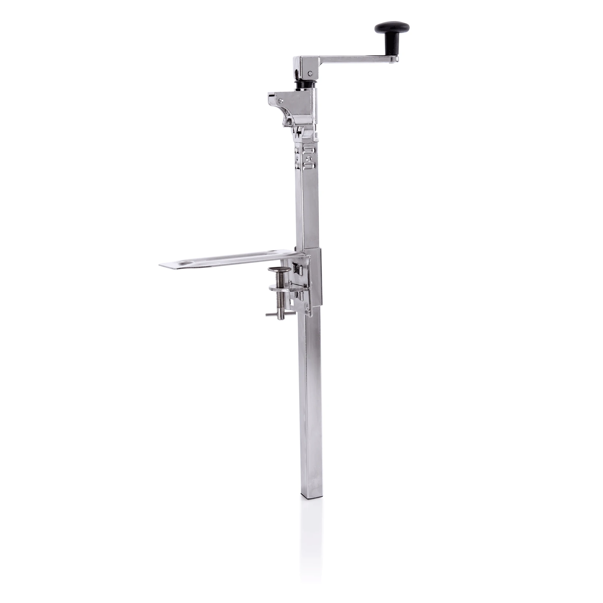 The tin opener is designed for tins up to 50 cm in height. It features an adjusting screw for secure table mounting. The standing tube is nickel-plated, and the base plate is chrome-plated, ensuring durability and a sleek appearance.
