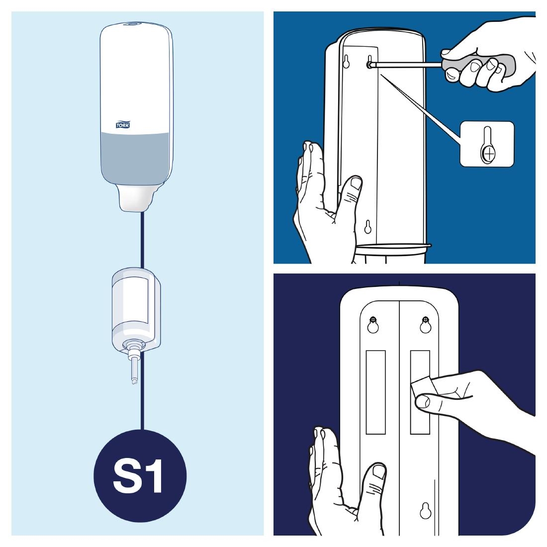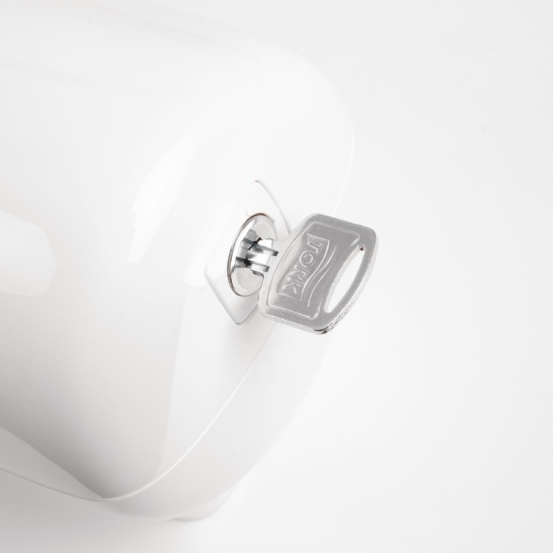 The soap dispenser is designed for use with Tork liquid and spray soap bottles. It provides a cost-efficient and hygienic solution for soap dispensing.