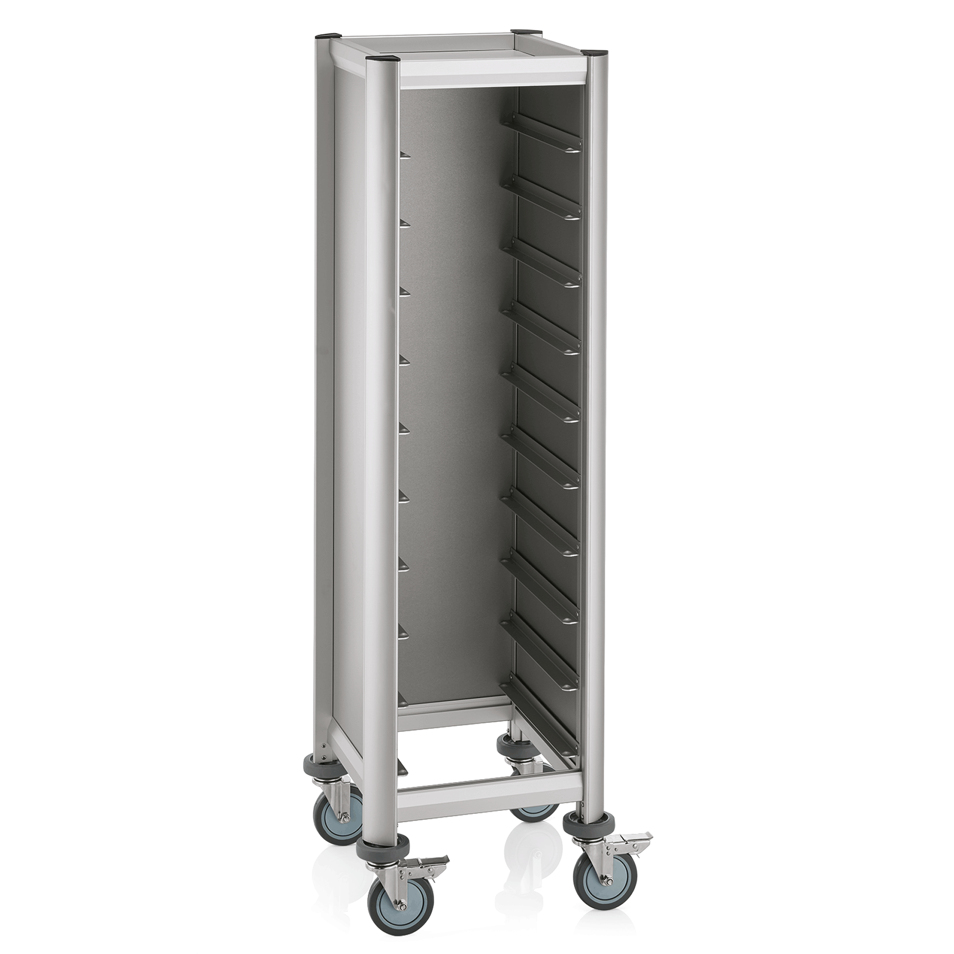 The product features 10 trays, each measuring 45.5 x 35.5 cm. It is constructed with aluminum profiles and MDF side panels, ensuring durability and stability. The unit is equipped with four swivel castors, each with a diameter of 12 cm, and includes bumpers for added protection. Additionally, two of the castors are fitted with brakes for secure positioning.
