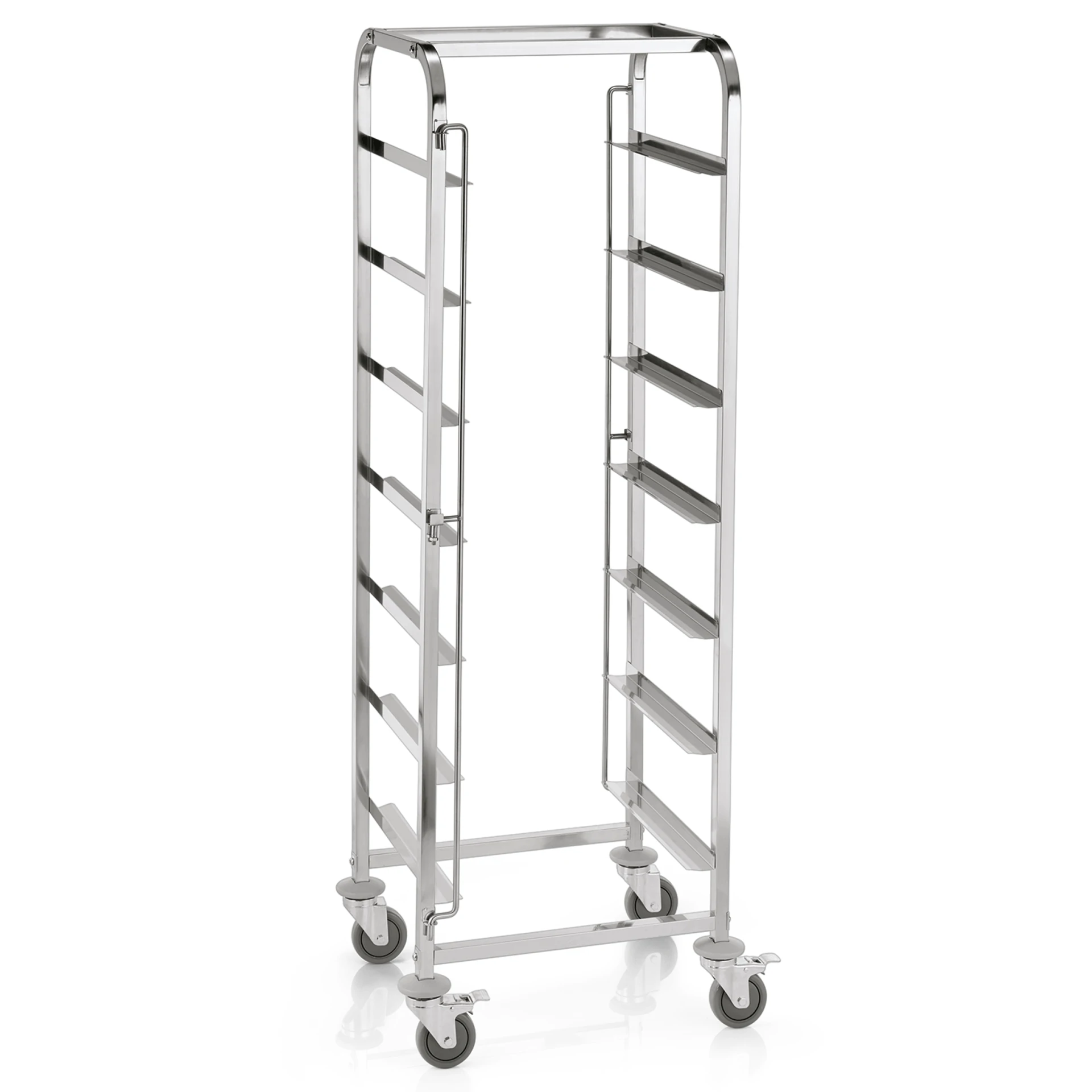 The product features seven rails and four swivel castors, two of which are equipped with brakes. It includes a safety catch to prevent the racks from slipping out, ensuring stability and security during use.